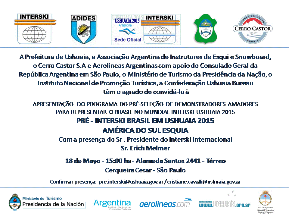 – Informações: pre.interski2015@ushuaia.gov.ar – cristiane.cavalli@ushuaia.gov.ar – Tel +54 2901 434 771