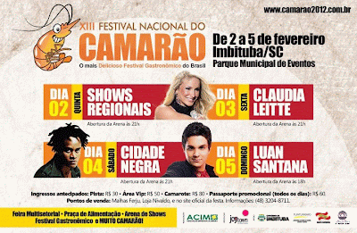 Entre os dias 2 e 5 de fevereiro, Imbituba também sedia a 13ª edição do Festival Nacional do Camarão. Além da feira multisetorial e de uma ampla praça de alimentação, o evento contará com shows de Cláudia Leitte, Cidade Negra, Luan Santana e atrações regionais. A edição 2012 do Festival Nacional do Camarão está estruturada a partir de três grandes eixos: a feira multisetorial, a praça de alimentação e uma arena de shows. De acordo com a Associação Comercial de Imbituba – organizadora do evento – a feira multisetorial contará com 40 expositores, 30% a mais que na edição anterior, gerando oportunidades de negócios para a indústria, comércio e turismo. A praça de alimentação, por sua vez, foi ampliada, oferecendo 14 opções de restaurantes e espaço para até 1.500 pessoas sentadas em espaço coberto.