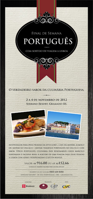 O bacalhau é a estrela também nos pratos principais: em bolinhos, à Gomes de Sá ou com batata broa. Além disso, também haverá lombo suíno ao vinho do porto, carré de cordeiro com castanha portuguesa e molho de hortelã, entre outros. Para a sobremesa, as melhores doçuras portuguesas: terrine de castanhas, ovos moles de Aveiro, pastel de Belém, papo de anjo e queijadinha, entre outras delícias. Para quem quiser aproveitar o feriado na charmosa Gramado e o jantar, o Serrano oferece um pacote especial. O Jantar Especial Português encerra o ciclo 2012 do projeto Sabores do Mundo – as edições anteriores celebraram as culinárias alemã, francesa, argentina e brasileira e portuguesa. “O projeto é um sucesso absoluto. Tanto que em breve já vamos divulgar as primeiras datas dos jantares temáticos para 2013”, comemora o gerente-geral do Serrano, Rogério Poloni.