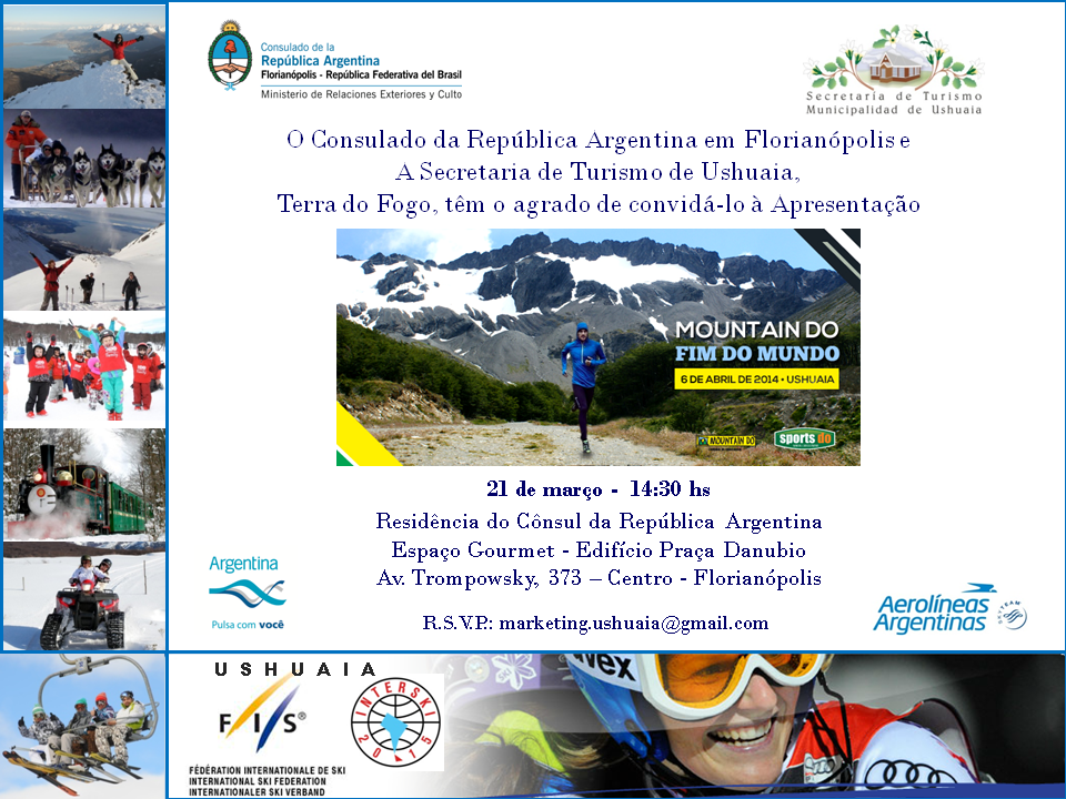 Acontece nesta sexta-feira, às 14:30 horas, no Consulado da Argentina, em Florianópolis – SC, Coletiva de Imprensa. Na pauta o lançamento da Maratona do Fin do Mundo MONTAIN DO, um dos eventos mais concorridos do mundo e que sempre acontecem em lugares fenomenais/paradisíacos e desta vez uma das etapas acontecerá em Ushuaia – Tierra del Fuego – no fim do mundo literalmente e, segundo fontes oficiais o evento está sendo disputadíssimo principalmente pelo local onde irá acontecer. A imprensa terá acesso após confirmar a presença no e-mail abaixo (convite).