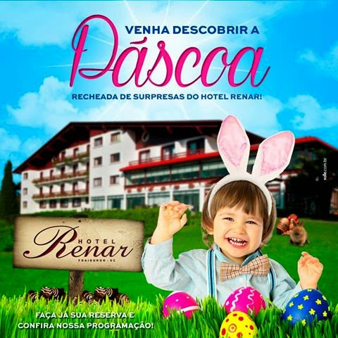 O Hotel Renar preparou uma páscoa recheada de surpresas para você e toda a família. No pacote estão incluídas a visita do coelhinho no domingo de páscoa, refeições no Restaurante das Estações momento Renar, luau, recreação e muito mais… mas é bom fazer tua reserva urgente. hotelrenar@hotelrenar.com.br – (49) 3246-9000 | 0800 643 7222.