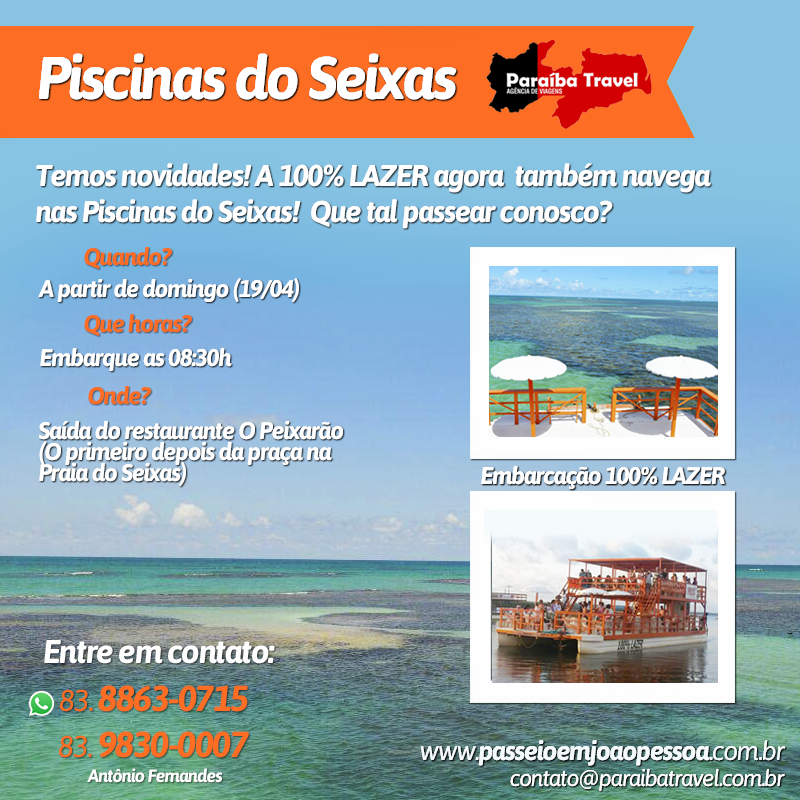 A Paraíba Travel do mestre e comandante Antonio Fernandes tem novidades. Seu catamarã 100% Lazer leva você até as Piscinas do Seixas que estão localizadas a apenas 500mt da costa da Praia do Seixas, próximo ao Ponto Extremo Oriental das Américas. Trata-se de um imenso banco de corais, cobertos pela água do mar e que ficam visíveis quando a maré está baixa, formando piscinas naturais de água morna e cristalina que nos permitem visualizar peixinhos coloridos e outros animais marinhos.
