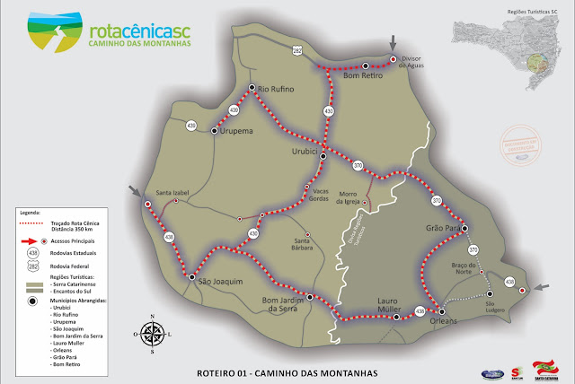 O território catarinense é cortado por rodovias localizadas em cenários deslumbrantes e únicos, com paisagens que oferecem uma experiência inesquecível. O projeto Rotas Cênicas Catarinenses visa destacar a riqueza natural, histórica e cultural dos ambientes por onde elas passam, valorizando os elementos que formam esta paisagem e contribuindo para a qualidade turística do trajeto percorrido. Consideramos Rota Cênica, uma estrada que possua qualidades paisagísticas, naturais, culturais e geológicas, com edificações e outras ações humanas que se encontram propícias para receber intervenções que visam proteger e valorizar tais características e com isto, fomentar o desenvolvimento econômico através do turismo e da recreação.