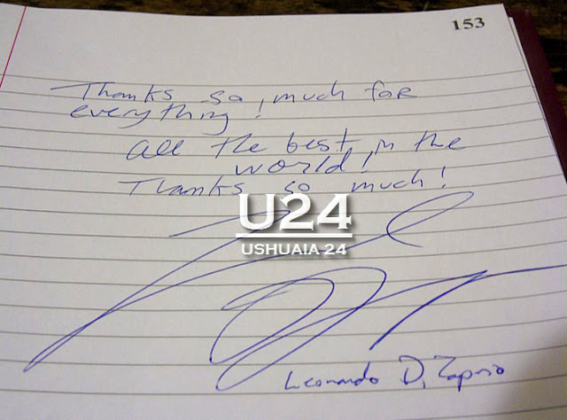 Suas aventuras são capturadas por locais e turistas que cruzam com o ator hollywoodiano. Na semana passada, o ator saiu para comprar uma câmera em uma loja na rua Gobernador Paz. Neste domingo DiCaprio visitou o Velho Armazém de Maipú e Fadul. Não fez reserva alguma para ele e para seus três seguranças que não permitem chegar perto dele. De acordo com Ushuaia 24 anos, ele foi várias vezes. Depois de desfrutar da gastronomia local, o ator deixou o local, colocando um boné e óculos, falando em seu celular.