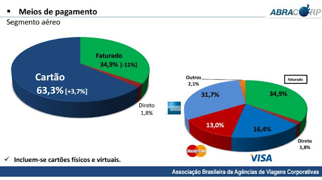 Em relação ao setor aéreo, o cartão de crédito é o meio mais utilizado, com com 63,3%, registrando um crescimento de 3,7% em relação a 2014. Na sequência, aparecem o pagamento faturado, com 34,9% (-11%), e pagamento direto (1,8%). O American Express obteve 31,7% das transações, seguido por Visa (16,4%) e MasterCard (13%).