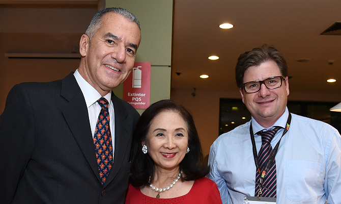 João Sabino, Abav Nacional, com Chieko Aoki, da Blue Tree, e Eduardo Loch, da Abav Santa Catarina
