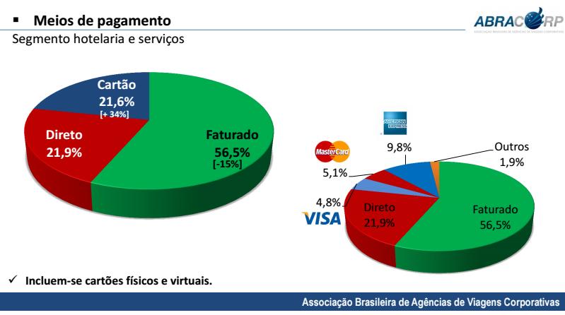 No segmento de hotelaria, os pagamentos diretos respondem por 21,9%, seguidos pelo cartão de crédito, com 21,6%. Apesar de ainda ser a opção menos utilizada, a utilização dos cartões corporativos físicos e virtuais cresceu 34% em relação a 2014, enquanto o faturamento recuou 15% no período. O American Express respondeu por 9,8%, seguido por MasterCard (5,1%) e Visa (4,8%).