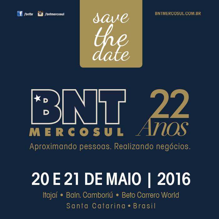 Em maio, a BNT Mercosul chega à sua 22ª edição em Itajaí, Balneário Camboriú, e Beto Carrero. Os diretores, Geninho Goes e Jair Pasquini esperam resultados positivos para 2016, e projetam um crescimento de 48% até 2025 por acreditarem na sede do evento, um local amplo e que pode atrair grande número de expositores. A equipe BNT acredita que as feiras de turismo têm vida longa, pois o contato B2B segue importante no segmento, e os eventos representam grandes oportunidades de negócios.