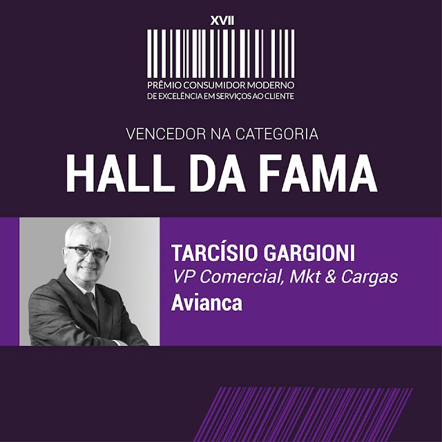 Como se fosse pouco, o grande amigo Tarcísio ainda, por contra da sua competência, levou o prêmio de executivo destaque e entrou para o Hall da Fama do Consumidor Moderno. Com 17 anos de história, a premiação mostra ao mercado as empresas que realmente enquadram seus clientes no centro de sua estratégia de relacionamento. Parabéns Tarcísio! Parabéns AVIANCA !
