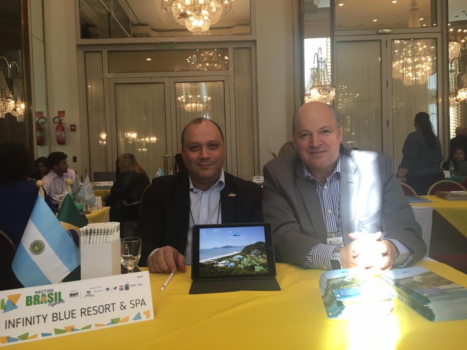 Alberto Cestrone, Diretor Geral do Infinity Blue Resort & Spa, o melhor resort para famílias do Sul do Brasil e Luis Eduardo Calle, encerrando mais um Meeting BNT na capital portenha. Segundo Cestrone: “Participar do Meeting Brasil em Buenos Aires é sempre sucesso pois a Argentina é principal emissora de turistas para o Brasil, o momento econômico para estar em nosso país é extremamente favorável e, somente neste último verão mais de dois milhões de argentinos estiveram no Brasil, a sua maioria em Santa Catarina”.