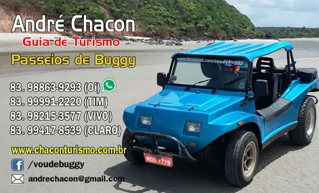 Atenção agentes, operadores e demais turistas que estarão chegando em João Pessoa. Existe diversos passeios que você pode fazer de buggy, com atendimento personalizado e com muita competência. Sempre faço. De verdade! Trata-se do André Chacon. Pode fazer tua reserva antecipadamente de preferência. O André sabe tudo, de extrema confiança e sem tempo ruim.