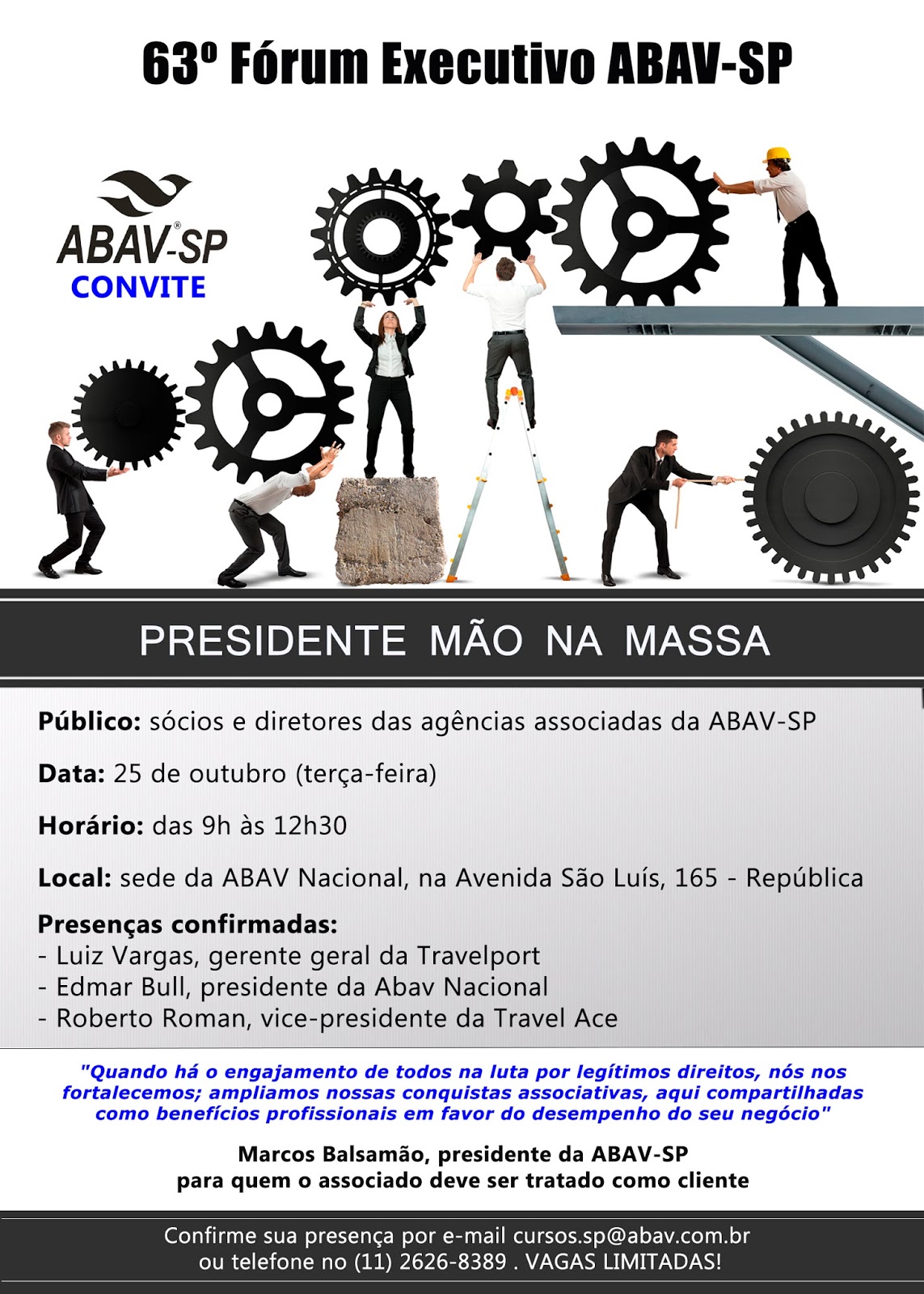 Uma pauta recheada de novidades positivas para o agenciamento de viagens como um todo vai compor a programação do 63º Fórum Abav-SP. Sob o tema instigante ‘Presidente Mão na Massa’, o evento será realizado nas dependências da Abav Nacional. Interessados devem confirmar presença pelo e-mail cursos.sp@abav.com.br. Na oportunidade, serão destacadas as parcerias com a Travel Ace Assistence (seguro viagem) e a Travelport (plataforma My PNR), ambas firmadas durante a 44ª Abav Expo Internacional de Turismo & 46º Encontro Comercial Braztoa.