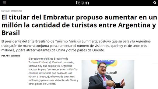 Depois do maior festival de turismo do Norte/Nordeste do país, oFESTIVAL JPA, que acontece nesta semana com a presença da Paragônia Fantástica, é a vez de chegarem mais argentinos a João pessoa. A informação é da Embratur que confirma a vinda de um grupo de 11 agentes de viagens de Córdoba (Argentina) no dia dois de novembro. A articulação do famtour passou pelo Escritório Brasileiro de Turismo na Argentina e está sendo organizado pela PBTur (Empresa Paraibana de Turismo), em parceria com a ABIH (Associação Brasileira da Industria Hoteleira, seccional Paraíba) e Abrasel (Associação Brasileira de Bares Restaurantes e Similares).