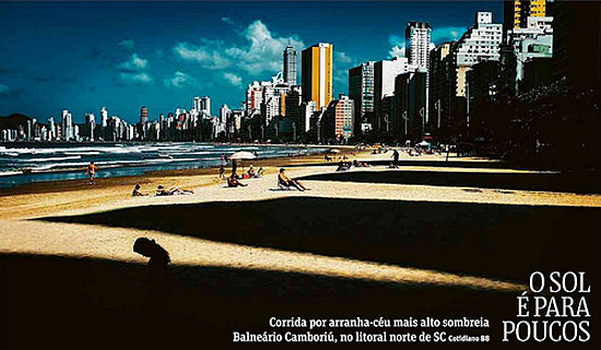 Como você pode ver nas imagens, a praia fica completamente escondida na sombra dos prédios a partir do meio da tarde, e conseguir um lugar ao Sol é um desafio tão gigantesco quanto os edifícios que cercam a praia. E esse não é o único problema, afinal os prédios altos também interferem nas correntes de ar marítimas, e as ruas no entorno se transformam em verdadeiros túneis escuros de vento. O sistema de tratamento de água e esgoto também já apresentam sinais de saturação segundo alguns ambientalistas, o que e ocasiona a poluição das águas e muitos dias de praia imprópria para banho durante o ano. Em Balneário Camboriú – o Sol é para poucos.
