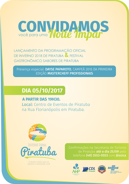 Doze hotéis participam da organização do evento chamado “Noite Impar”, que contará com a presença da Chef Dayse Paparoto, ganhadora da primeira edição do reality show de gastronomia no Brasil. A primavera se aproxima e dias mais quentes inspiram viajantes a fazerem as malas nos próximos meses. Para o setor hoteleiro, no entanto, é hora de planejar a temporada de inverno. Em Piratuba, no dia 5 de outubro, um evento gastronômico marca o lançamento da Programação Oficial do Inverno 2018 de Piratuba. Denominado “Noite Impar”, o jantar deve reunir cerca de 200 convidados, no Centro de Eventos de Piratuba.