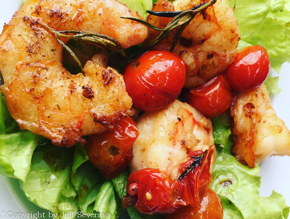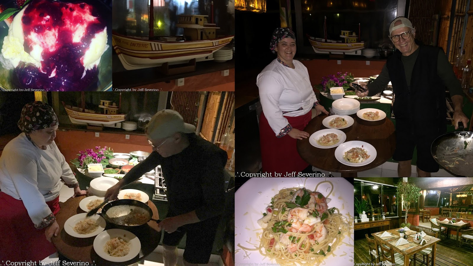 No sábado ele nos preparou um espetacular espaguete, receita que está na família ha longos e longos anos, com camarões e lula flambados na vodka, tomate concasse, suco de limão, manjericão, queijo grana padano e lâminas de alho dourado, e, de sobremesa, sorvete de creme com calda de amora. Pense numa coisa especial. É muito mais. Tudo é preparado na Ilha.