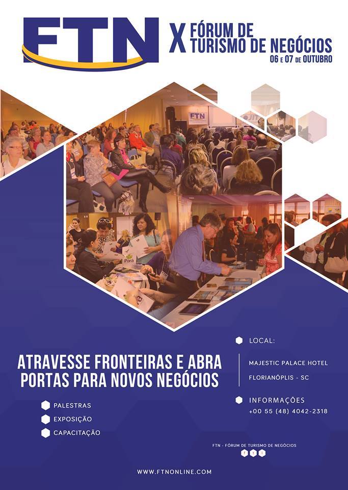 “A importância da promoção alinhada com a comercialização turística”, com destaque nas captações de recurso para projetos de turismo, será um dos temas das palestras. As palestras de qualificações são partes dos destaques da 10ª edição do FTN (Fórum de Turismo de Negócios), que será realizado em Florianópolis, no Hotel Majestic, nos dias 06 e 07 de outubro de 2017. No dia 07 de outubro será organizado um city tour para os visitantes, agentes de viagens e jornalistas convidados.