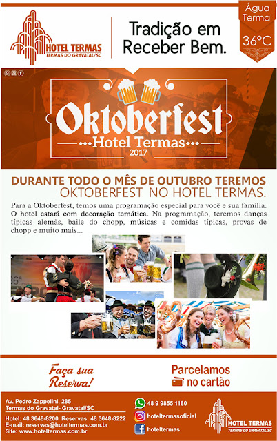 Hotel Termas em Gravatal promove o mês inteiro o seu tradicional Oktoberfest. Tem finais de semana que ainda tem vaga, mas é bom se antecipar.