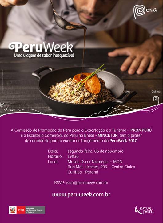 A Peru Week é a principal campanha de promoção do turismo e da gastronomia do Peru no Brasil, e neste ano conta com a participação de 136 empresas brasileiras, entre operadoras de turismo, companhias aéreas e restaurantes peruanos. A 5ª edição deste evento acontece entre os dias 06 a 22 de novembro, em Curitiba – PR e serão ofertados centenas de pacotes de viagens e passagens aéreas ao Peru a preços promocionais, e menus peruanos especiais serão servidos pelos restaurantes participantes também a valores exclusivos. Saiba mais no site:https://www.peruweek.com.br/.