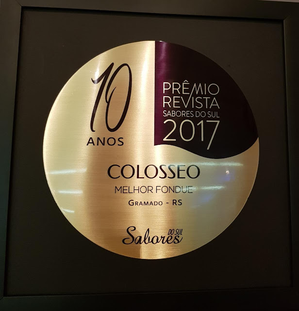 Mais de 180 mil votos garantiram a divulgação da lista dos melhores estabelecimentos de 22 cidades gaúchas, no Prêmio Revista Sabores do Sul, que, anualmente, convida seus leitores e internautas a participarem da votação popular e eleger os melhores restaurantes, bares, comidinhas, cafés, confeitarias e profissionais do circuito gastronômico que se destacam em seus segmentos. O Restaurante Colosseo participou da solenidade de entrega das placas aos vencedores na noite do dia 27 de novembro, no NH Hall, em Novo Hamburgo/RS, quando foi agraciado pelo sexto ano consecutivo como a Melhor Fondue de Gramado.Merecidamente, diga-se de passagem.