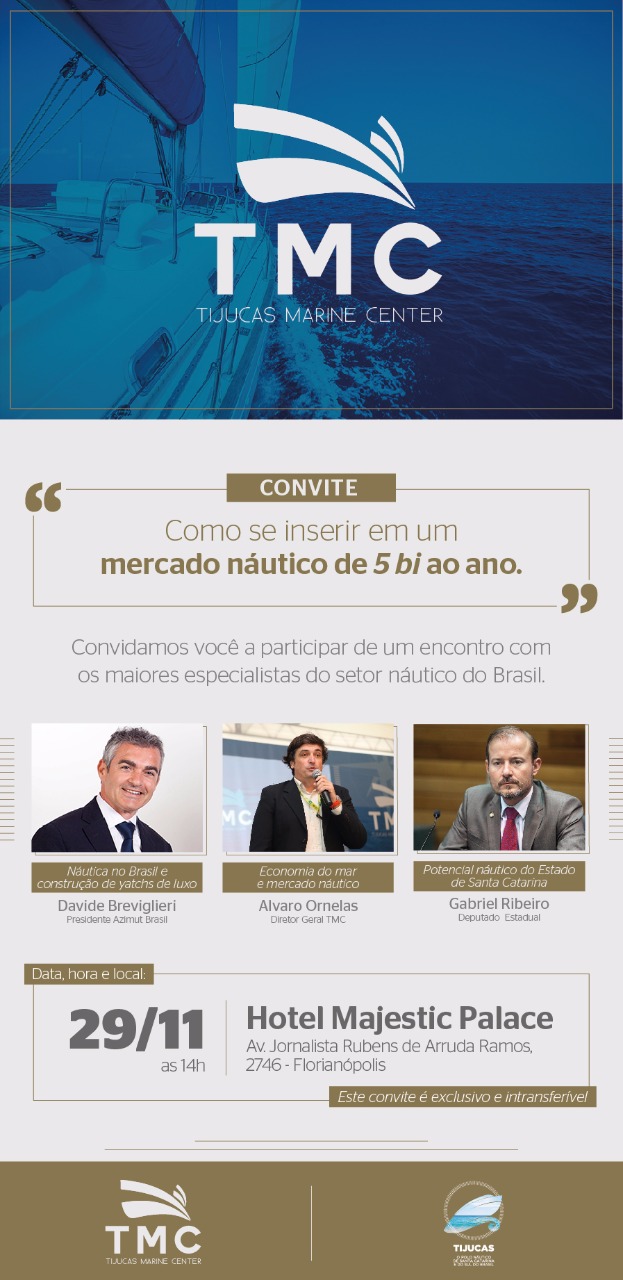 As vantagens em investir na economia do mar em Santa Catarina e como estar inserido em um negócio de R$ 5 bilhões anuais serão focos do workshop que empreendedores do Tijucas Marine Center promovem nesta quarta-feira, 29 de novembro, em Florianópolis. O evento, que acontecerá a partir das 14h no Hotel Majestic Palace, é aberto a empresários e potenciais investidores do setor e trará informações sobre mercado, benefícios tributários no Estado e oportunidades de investimentos no setor náutico em território catarinense.