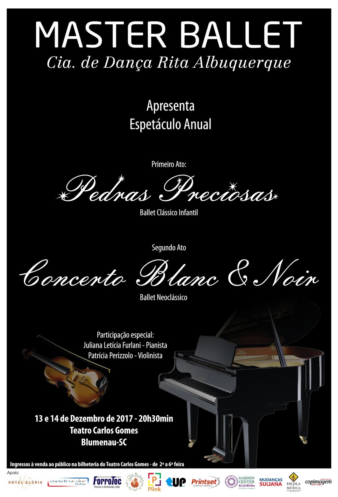 Ballet clássico e neoclássico. Nos dias 13 e 14 de dezembro, a Master Ballet Cia. de Dança Rita Albuquerque apresenta o espetáculo anual, no Teatro Carlos Gomes, em Blumenau. As apresentações ocorrem às 20h30min e os ingressos já estão à venda na secretaria do Teatro. Cerca de 110 alunos da Master Ballet se apresentarão no espetáculo, que tem por objetivo mostrar a evolução técnica e artística dos bailarinos. Nesta edição, o evento contará com a participação especial da pianista Juliana Letícia Furlani e da violinista Patricia Perizzolo.