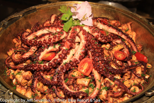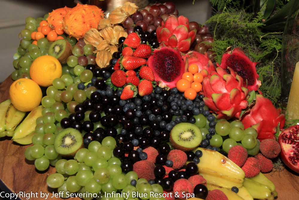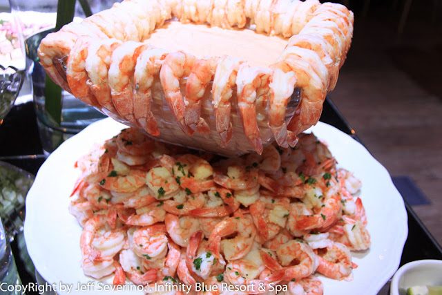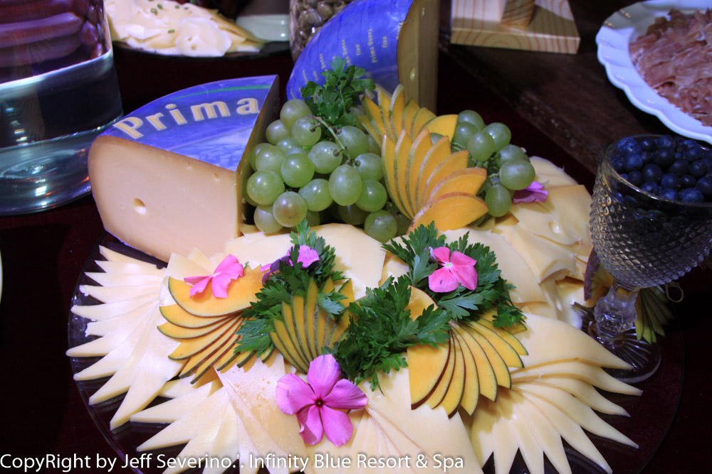 A gastronomia começou com uma imensa ilha de queijos: Prima Donna, Grana Padana, Ementhal, Gruyère, Provolone defumado, Pecorino (ovelha), Brie com favos de mel e geleia de pimenta, Pata negra (presunto de Parma), Salames Italiano, Copa curada, Pastrami, Torre de focaccia, Mini pães variados, Manteigas temperadas, Variedades de pastas.