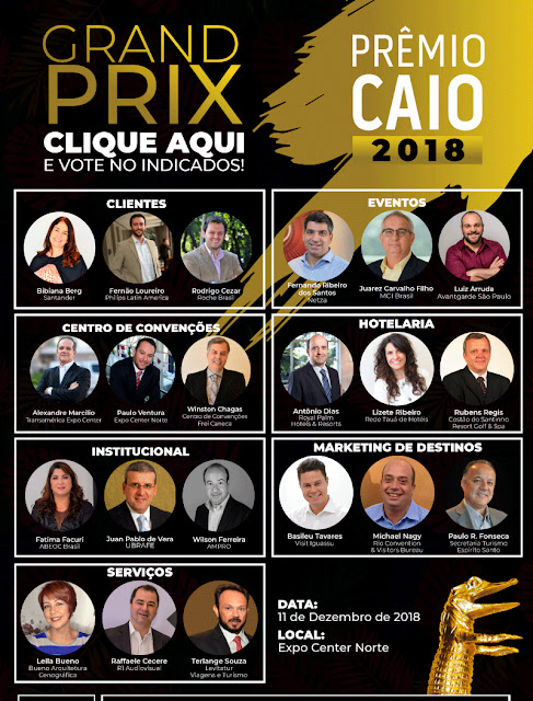 Entrou no ar nesta terça-feira, 13, o canal destinado à votação online para eleger os vencedores do Grand Prix Prêmio Caio 2018. Todos poderão votar em uma das três Personalidades do Ano, em cada um dos sete segmentos estabelecidos pela premiação. Ou seja: 1 – Centro de Convenções. 2 – Clientes. 3 – Eventos. 4 – Hotelaria. 5 – Institucional. 6 – Marketing de Destinos. 7 – Serviços. Os nomes dos representantes votáveis estão disponíveis no www.premiocaio.com.br. Nosso competente amigo Rubens Regis, capitaneando o Costão do Santinho Resort é um dos indicados e merece o voto. Não é à toa que é o melhor Resort do Brasil.
