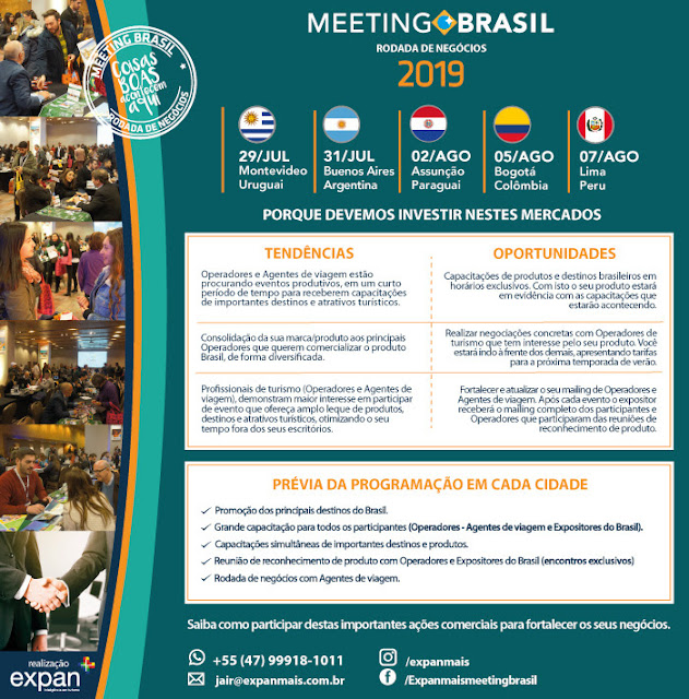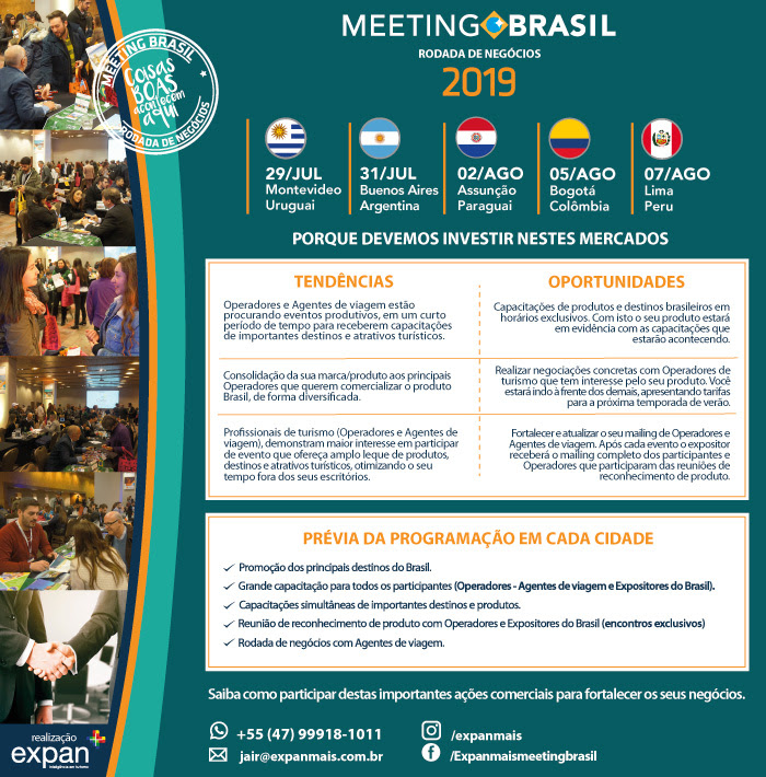 O MEETING BRASIL é realizado pela empresa Expan + “Inteligência em Turismo”, já por 23 edições realiza ações comerciais em outros países da América do Sul. Com ampla experiência no mercado, tem como principal objetivo a promoção do turismo Brasileiro (hotéis, receptivos, destinos e atrativos turísticos) para a geração de novos negócios entre empresários do Brasil com Operadoras de Turismo e Agencias de Viagem dos principais mercados Latino Americanos através de consultoria e encontros comerciais.
