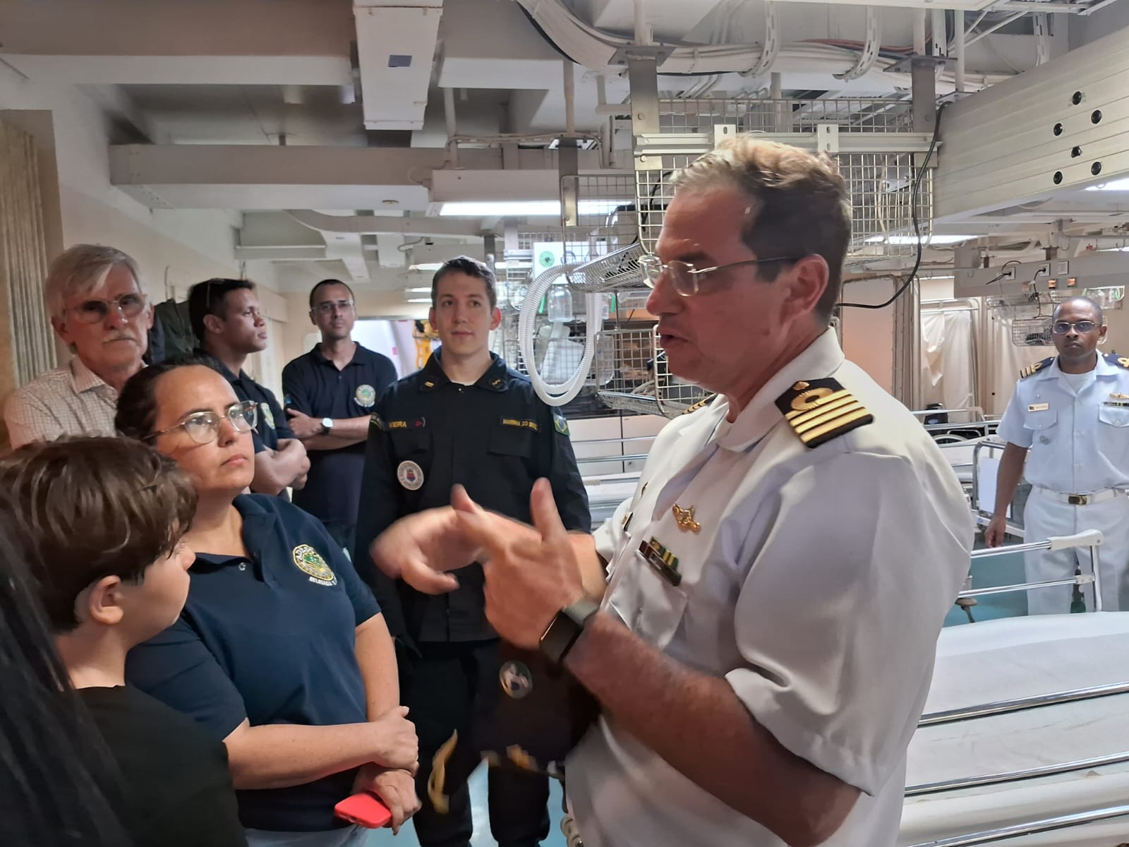 Os visitantes foram recepcionados pelo Capitão de Mar e Guerra Mello Santos, comandante do NDM Bahia, que conduziu a visita guiada e apresentou um vídeo institucional destacando as instalações modernas, os recursos tecnológicos e as múltiplas potencialidades operativas da embarcação. Atualmente, o navio conta com uma tripulação de aproximadamente 380 militares, entre homens e mulheres, altamente qualificados para atuar em diferentes tipos de missão.
