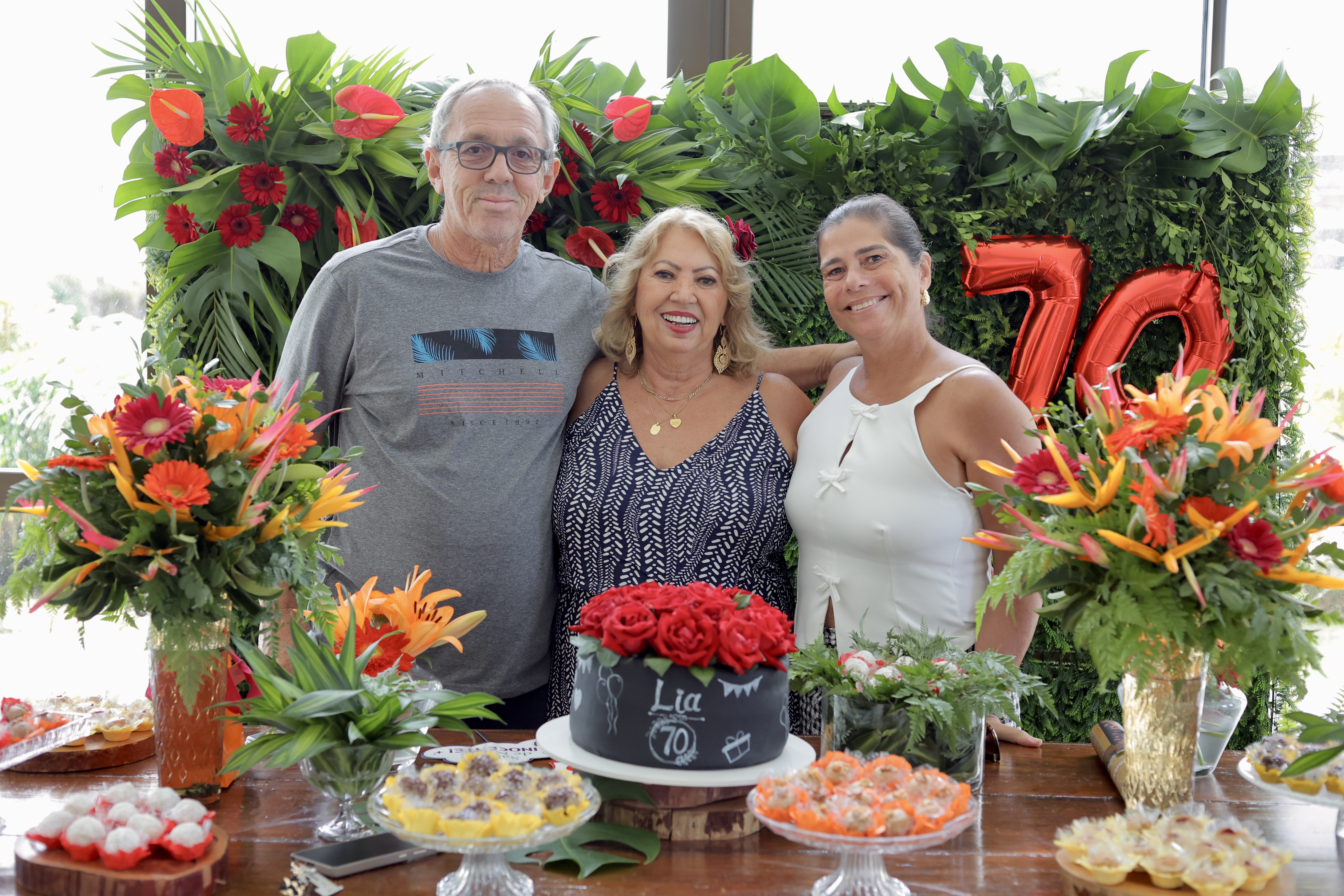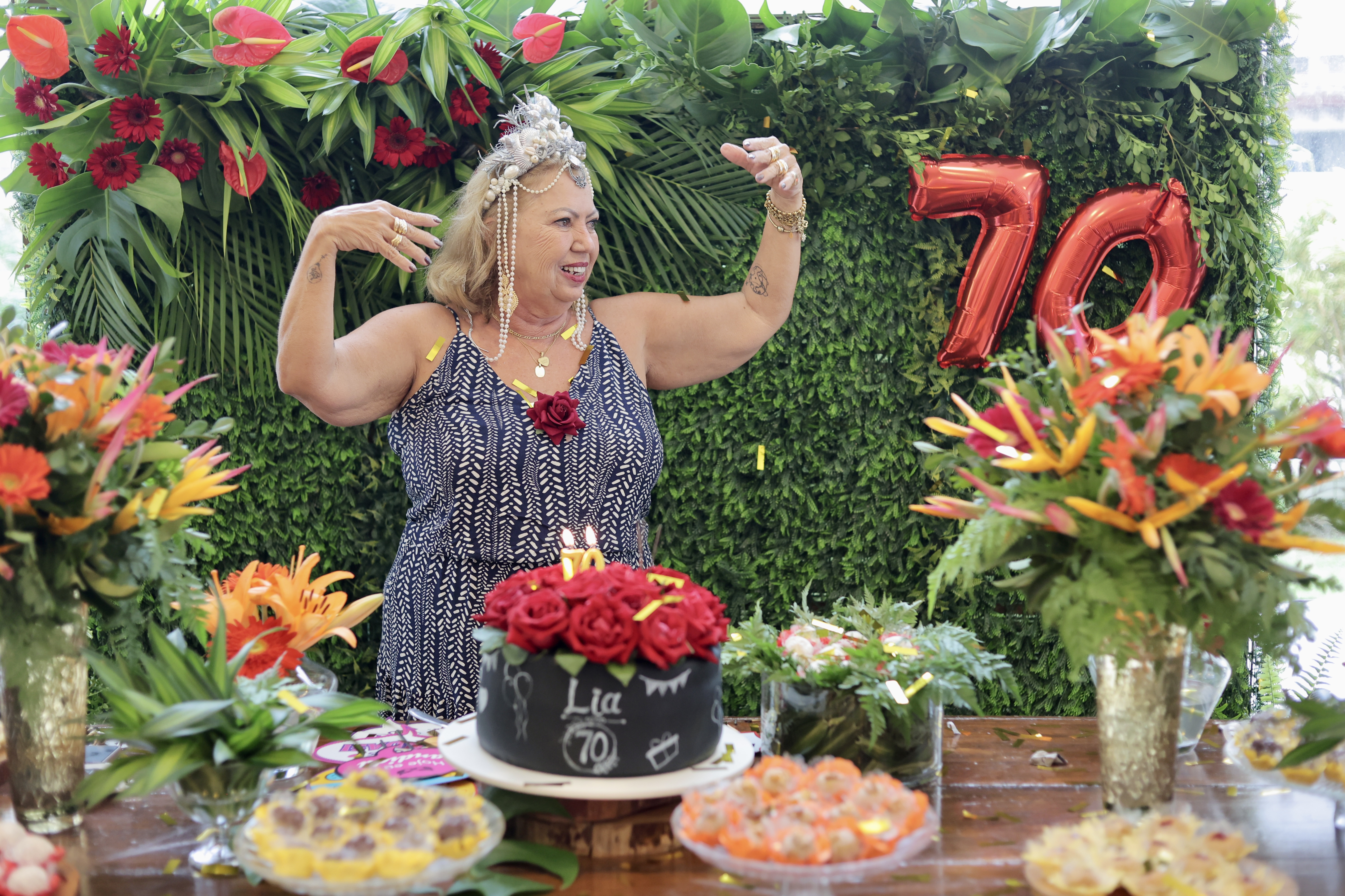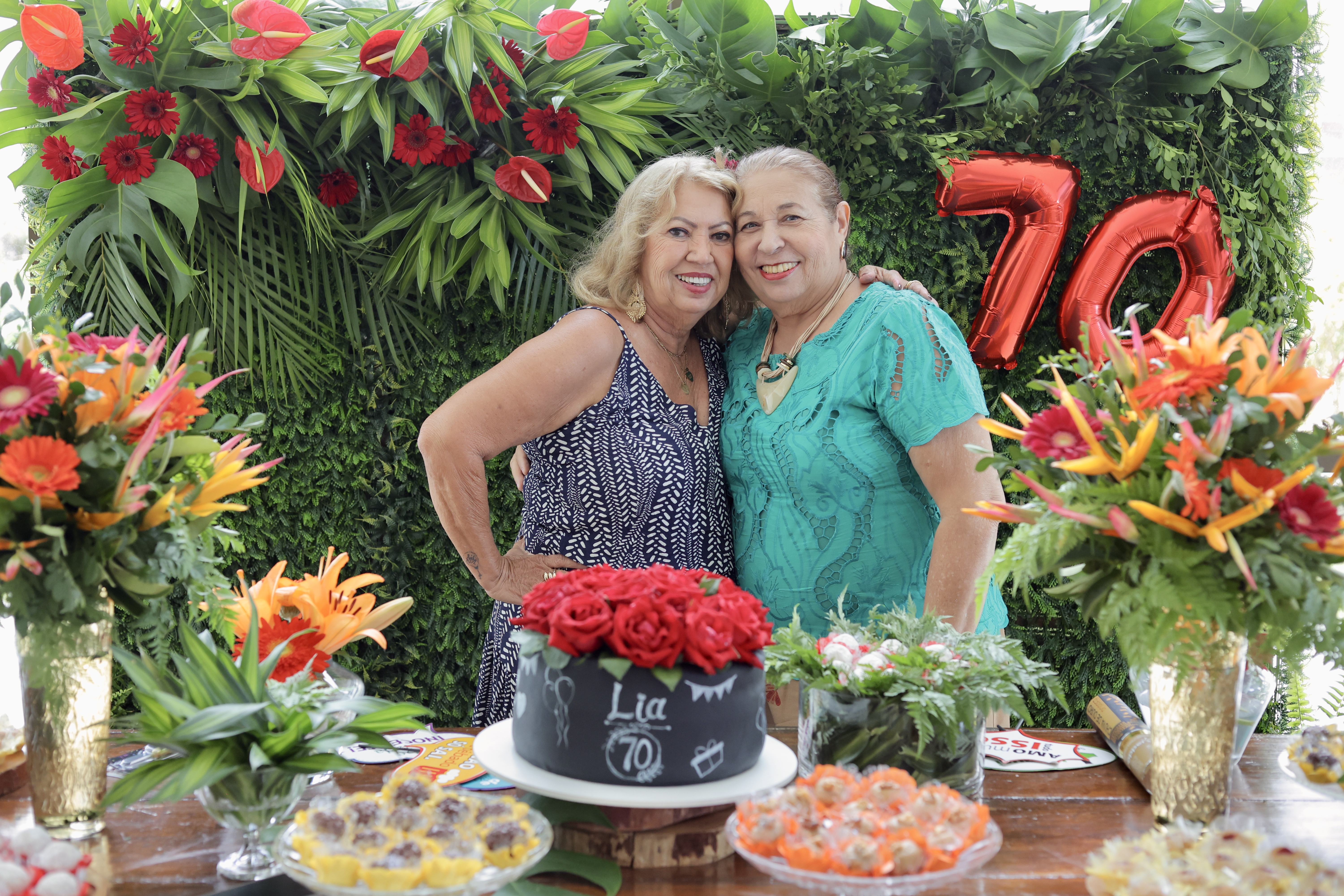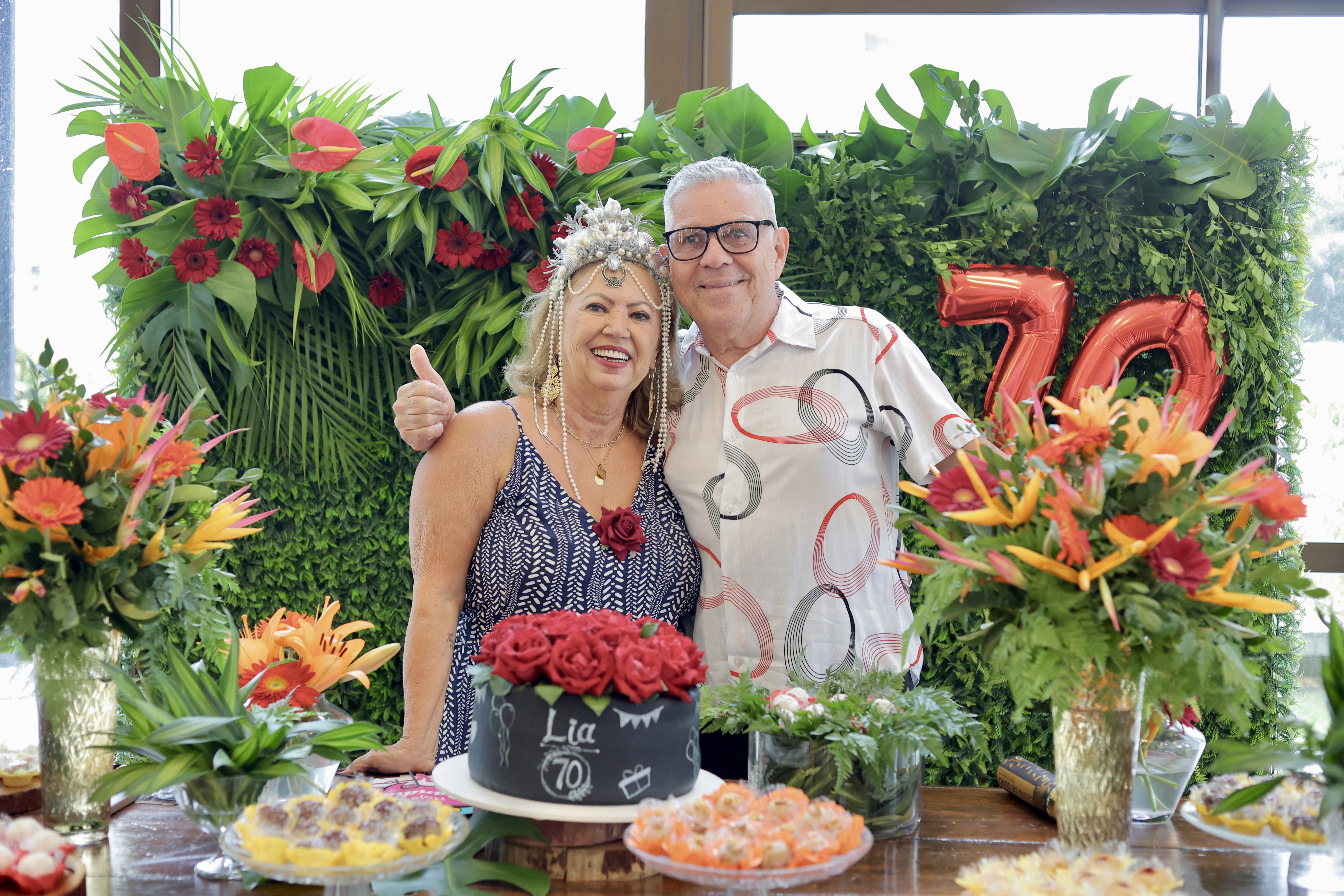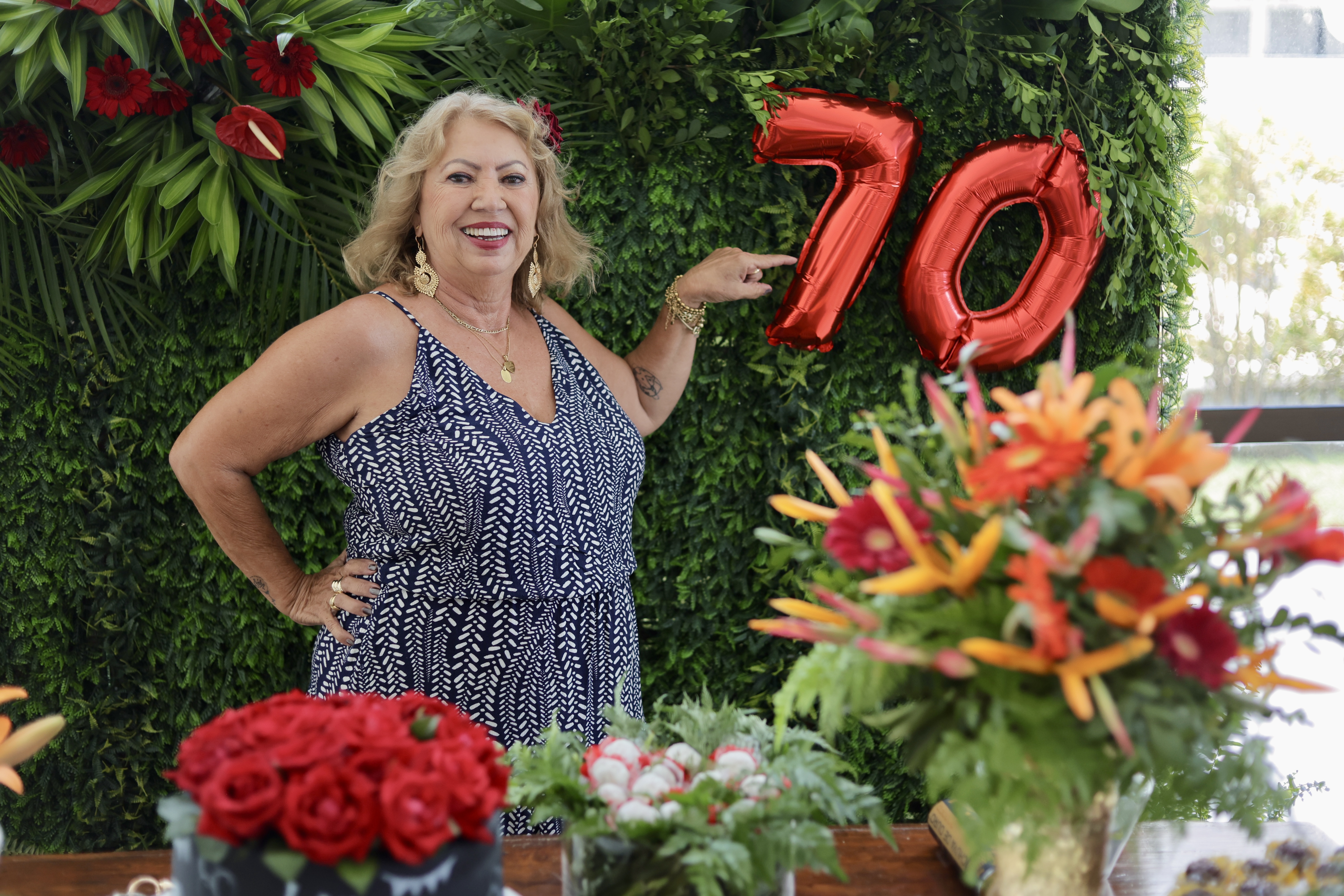 A aniversariante recebeu os convidados em um ambiente cuidadosamente decorado. O destaque ficou por conta do jardim vertical, que trazia o numeral 70 em evidência, simbolizando a nova década celebrada com entusiasmo, vitalidade e gratidão.