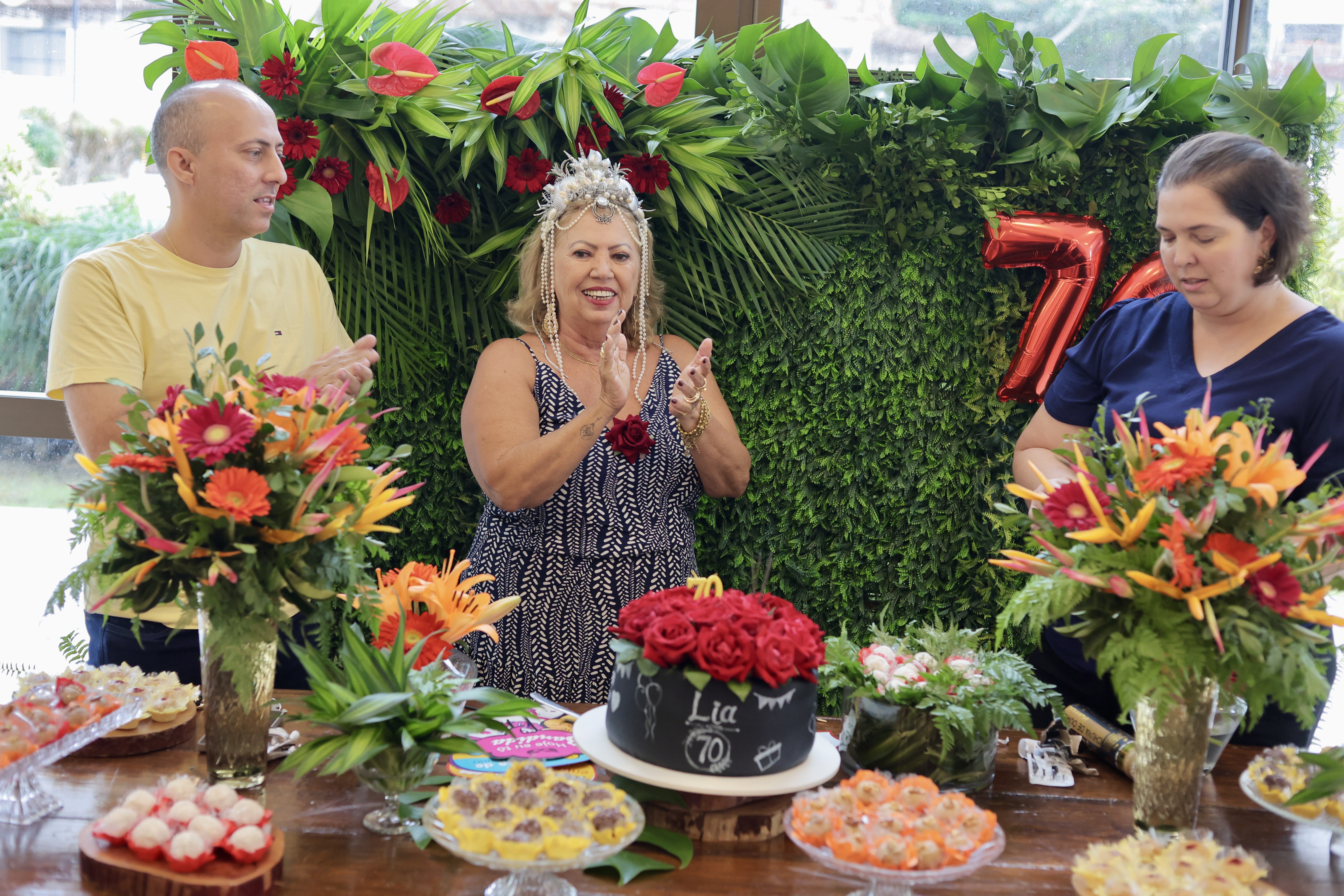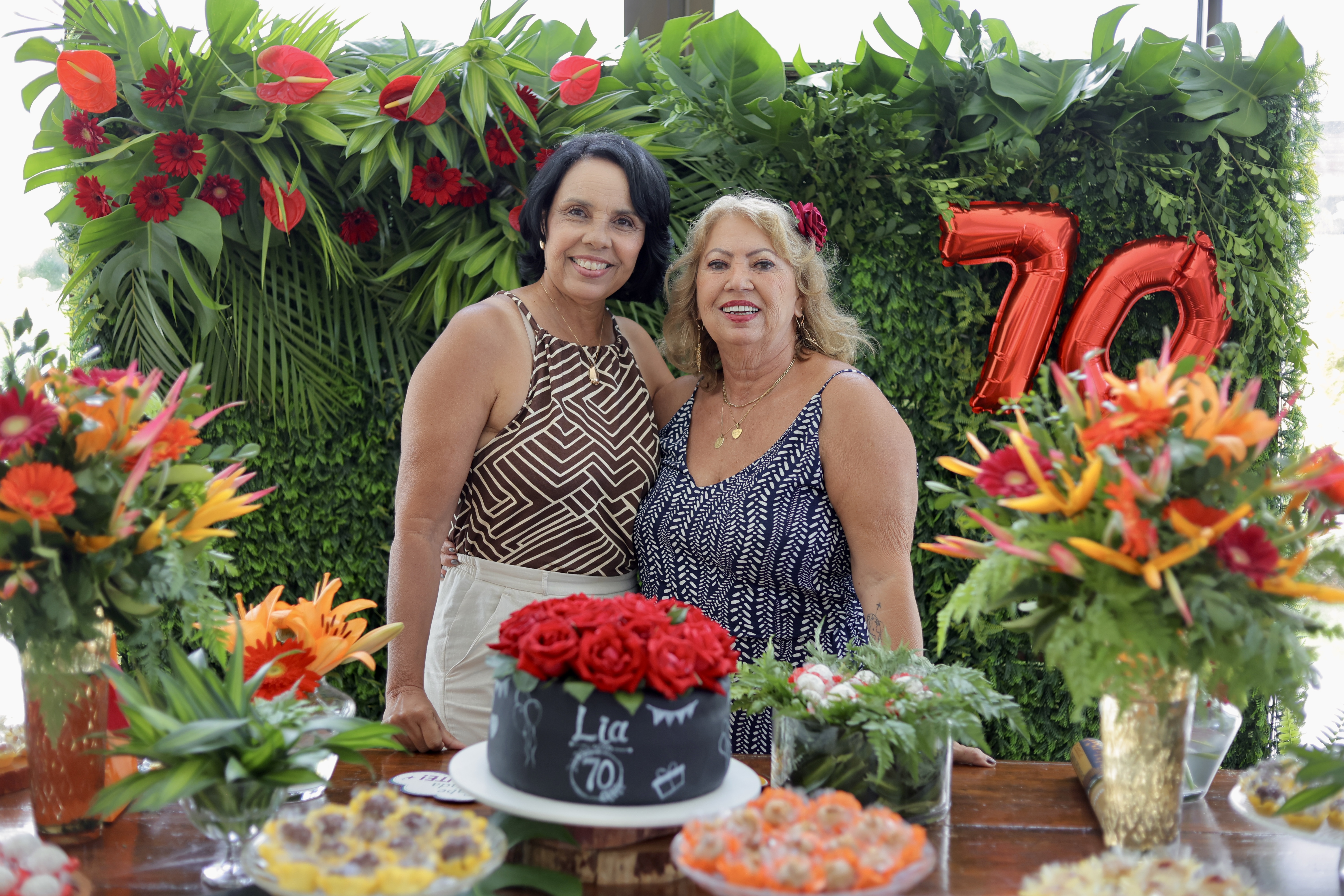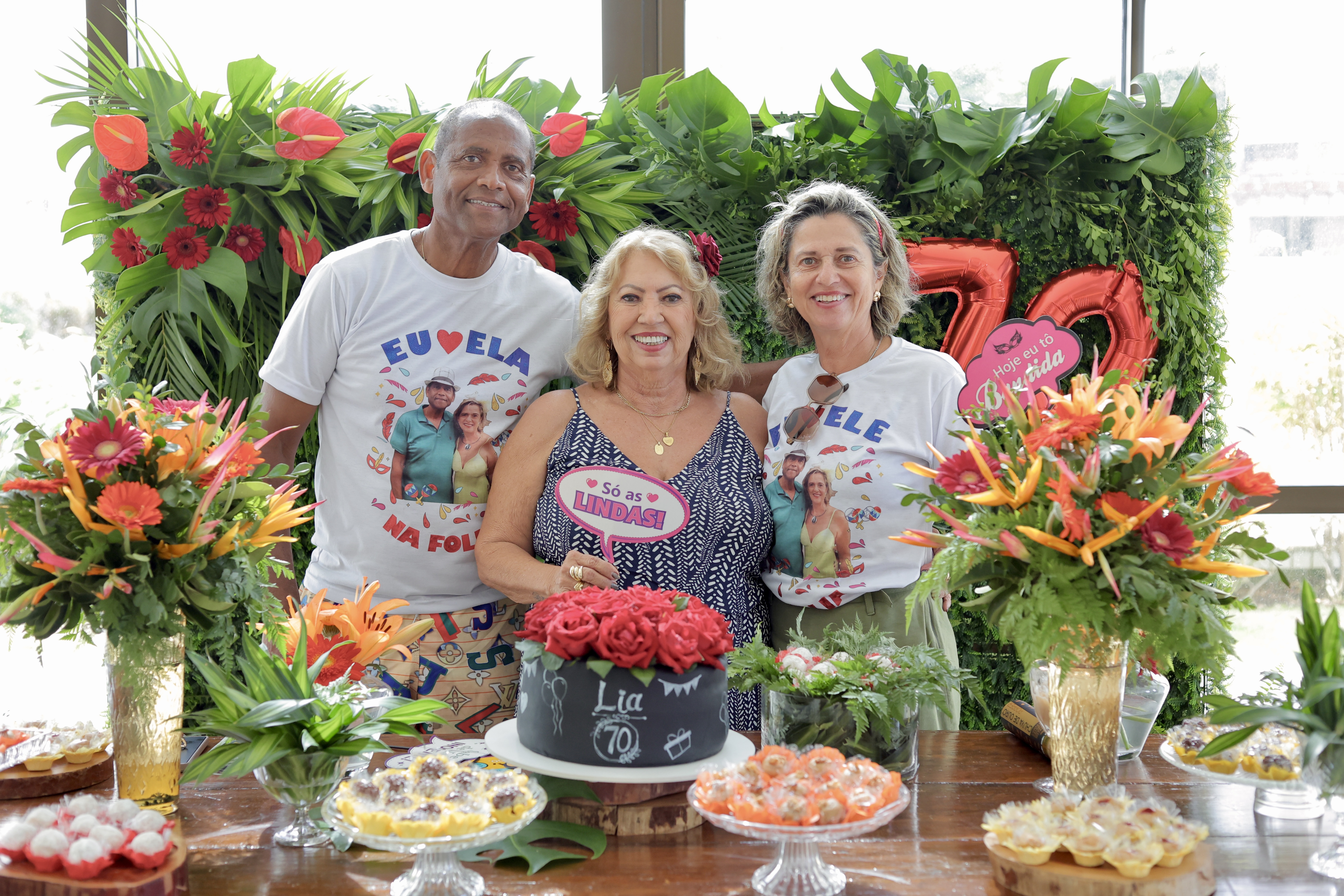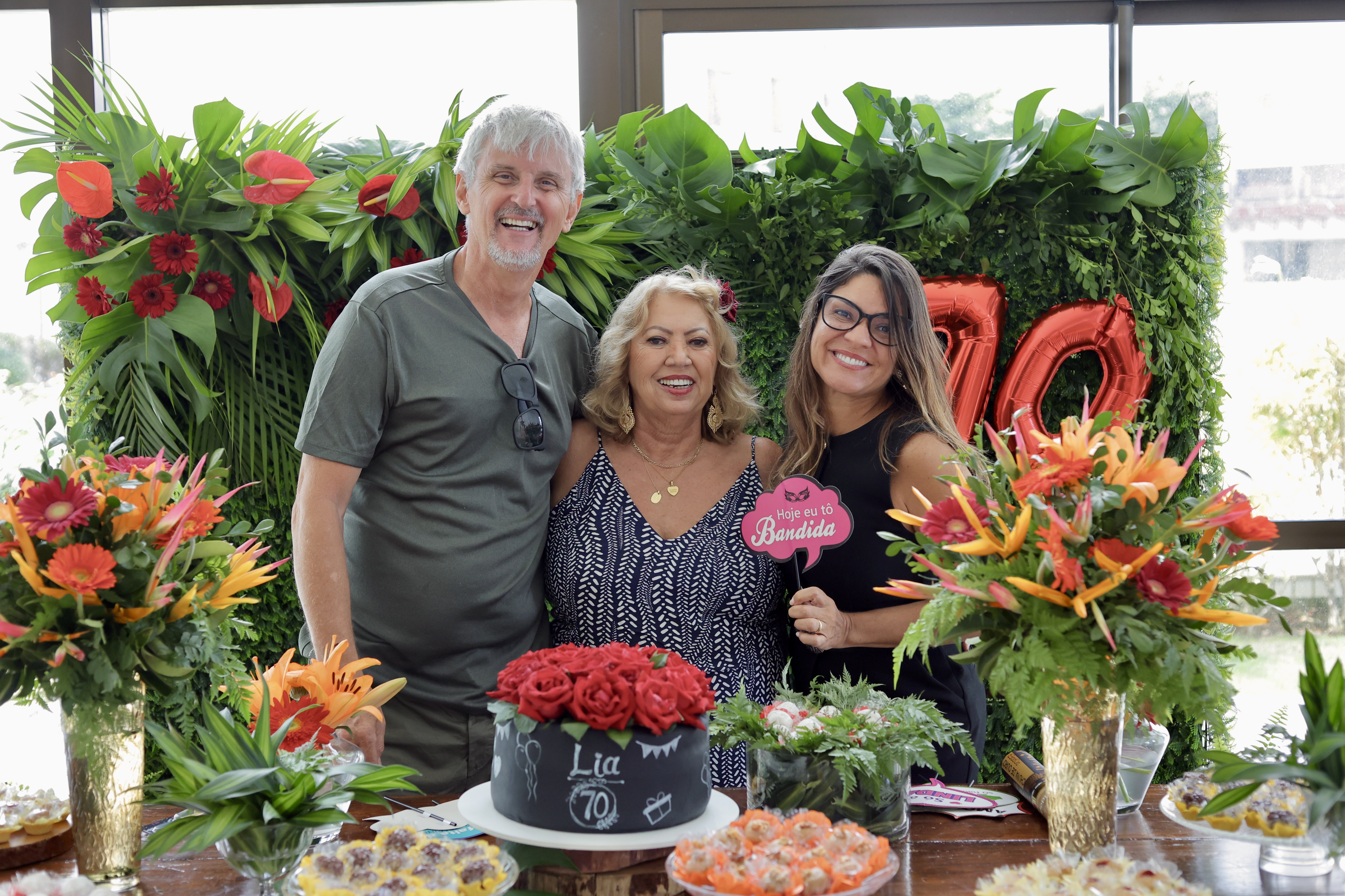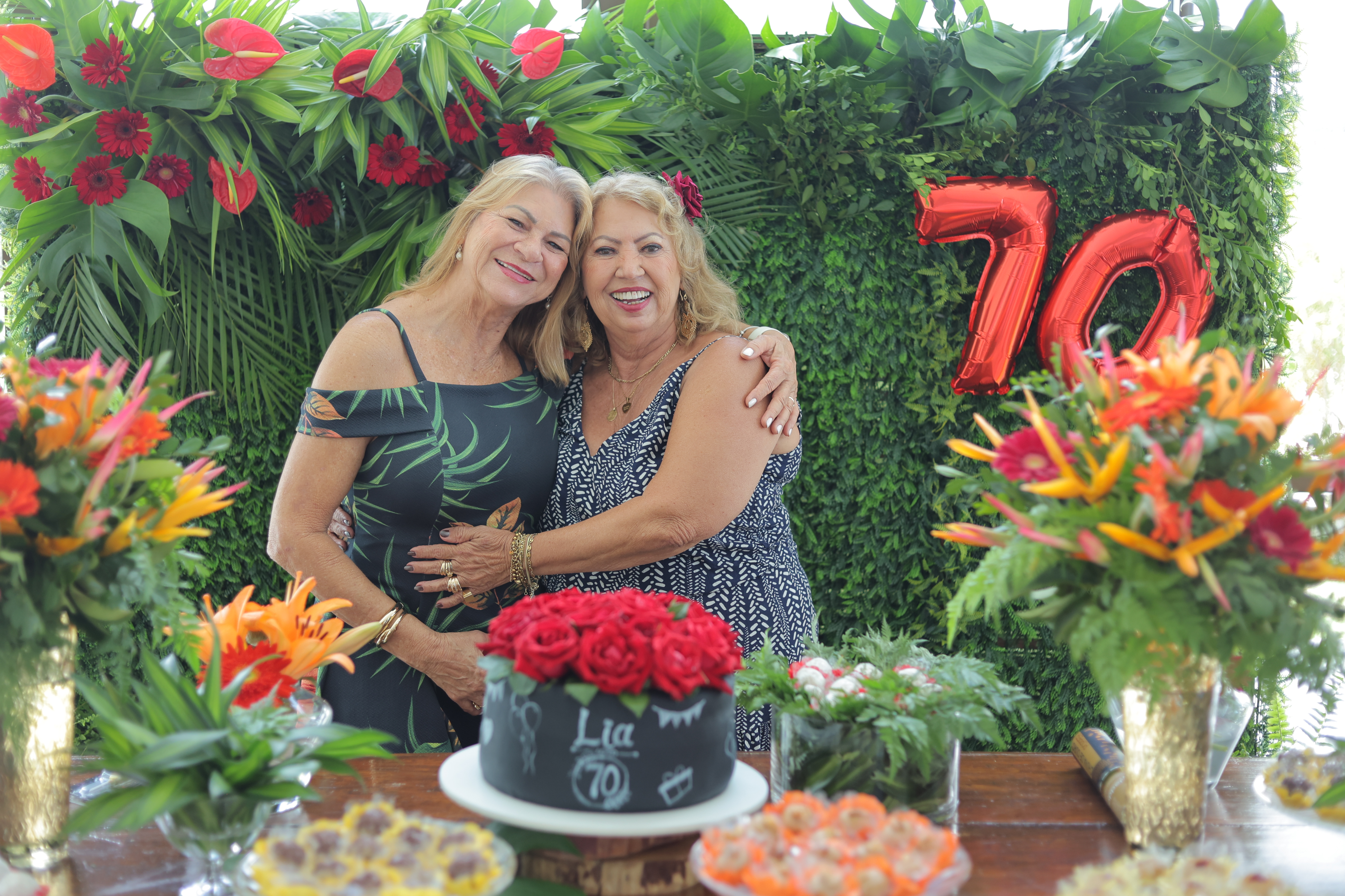 A aniversariante recebeu os convidados em um ambiente cuidadosamente decorado. O destaque ficou por conta do jardim vertical, que trazia o numeral 70 em evidência, simbolizando a nova década celebrada com entusiasmo, vitalidade e gratidão.