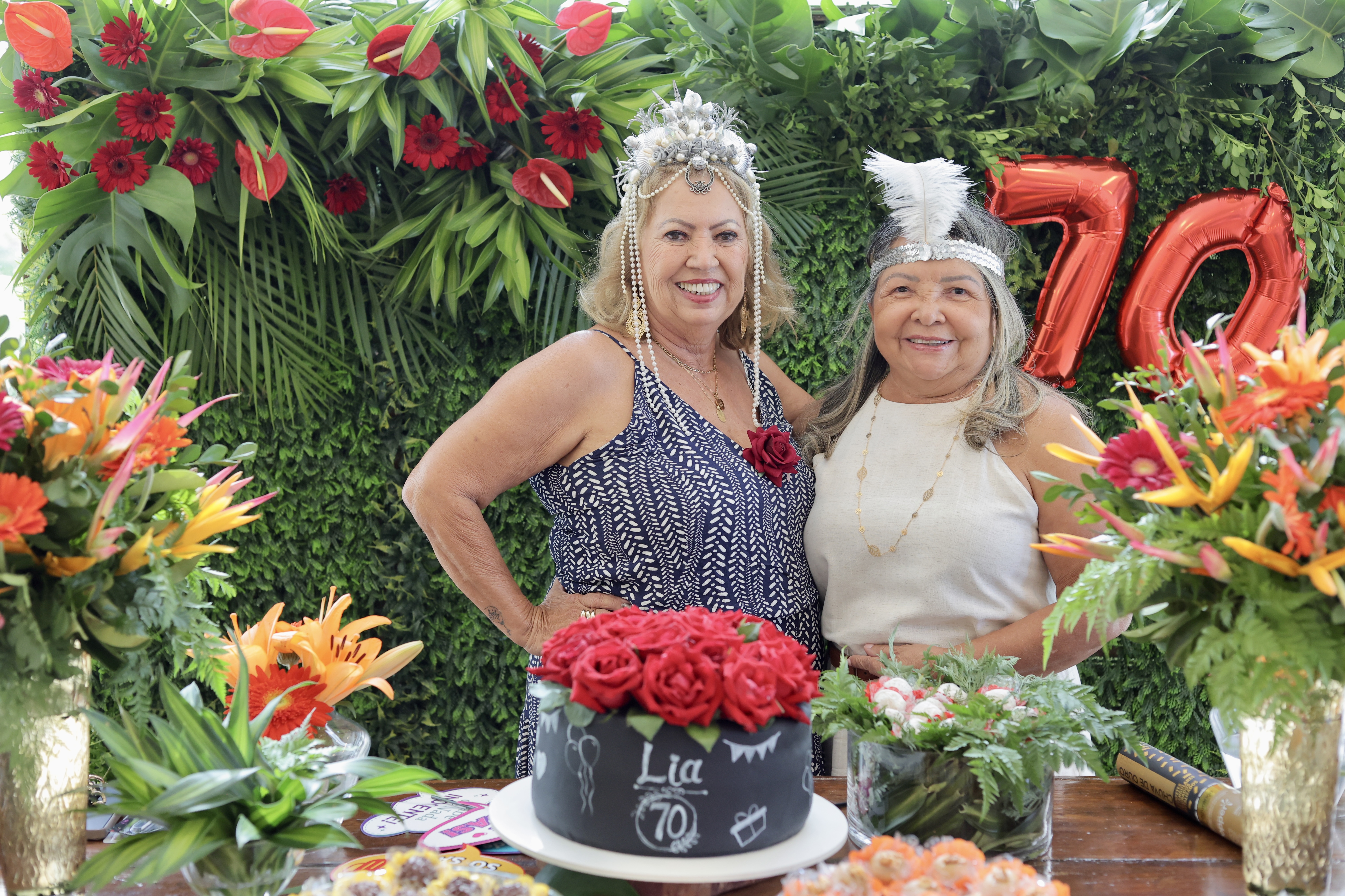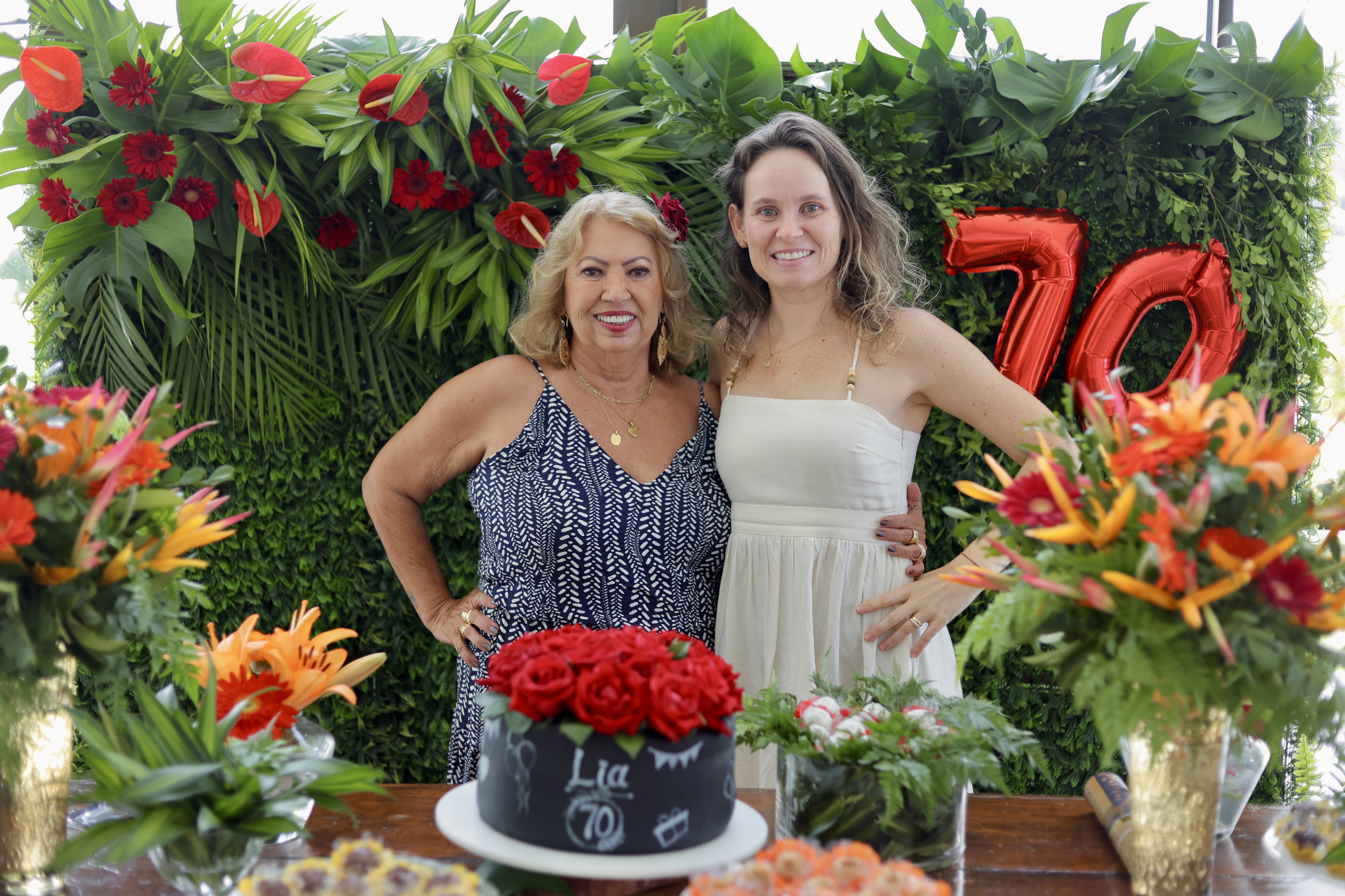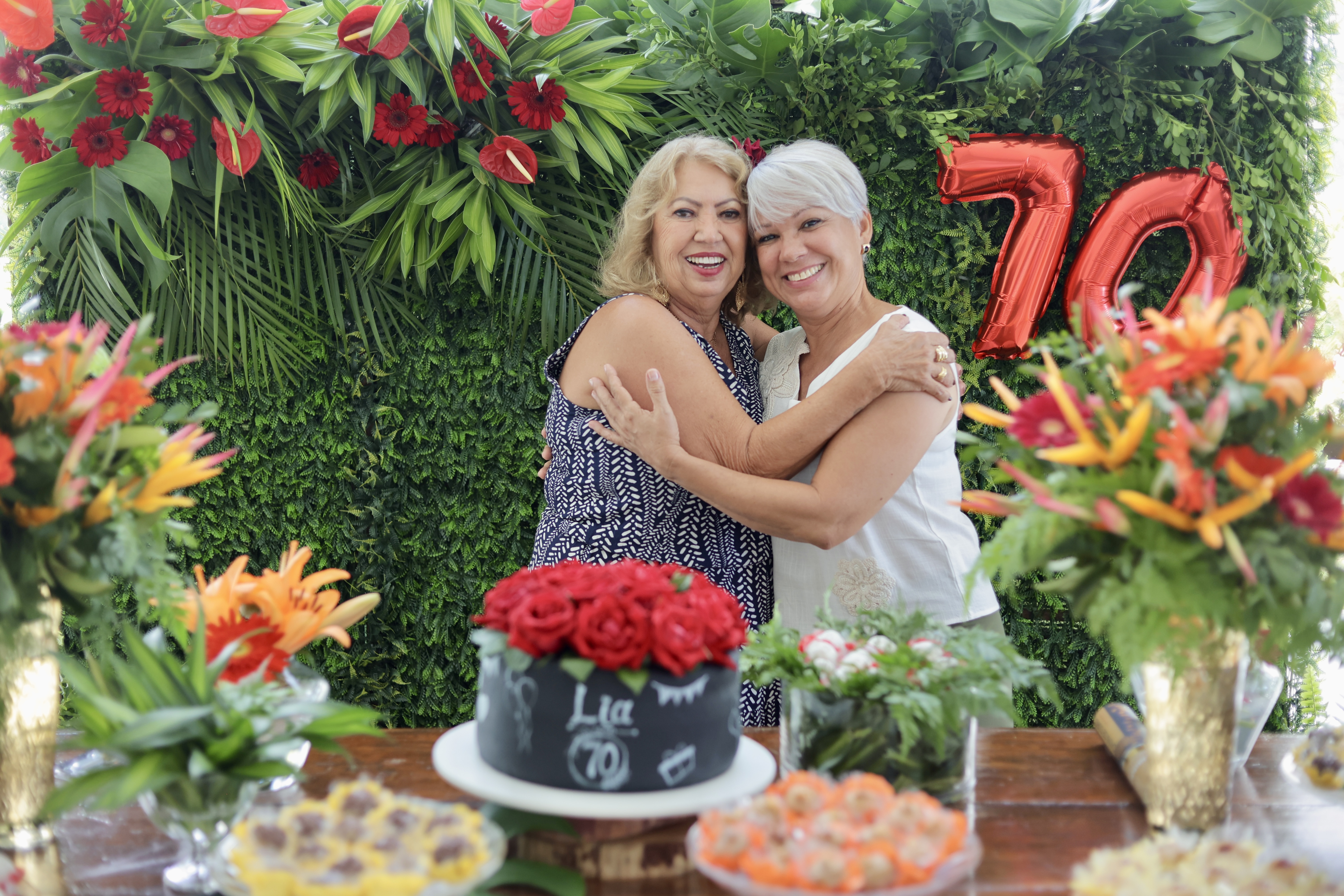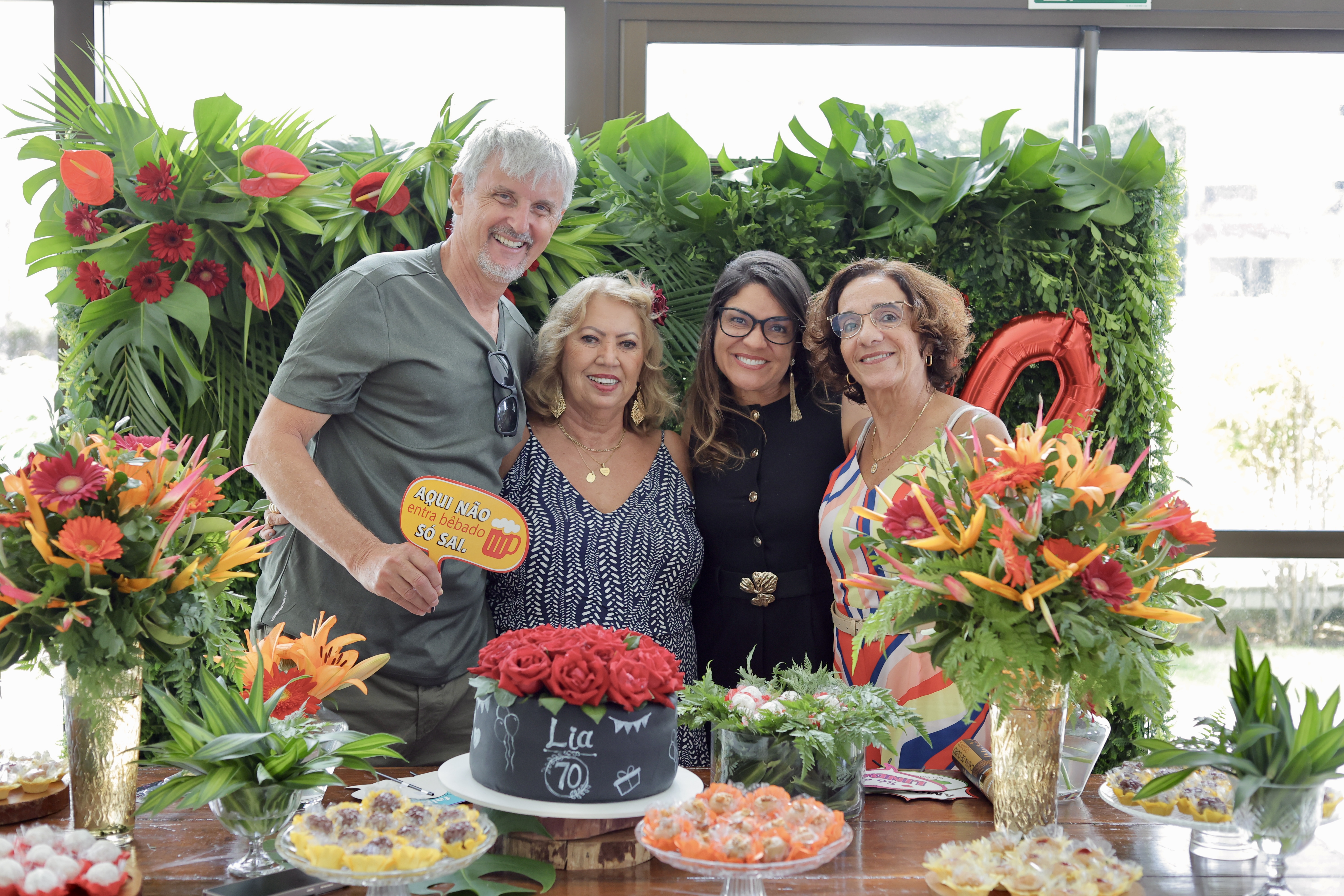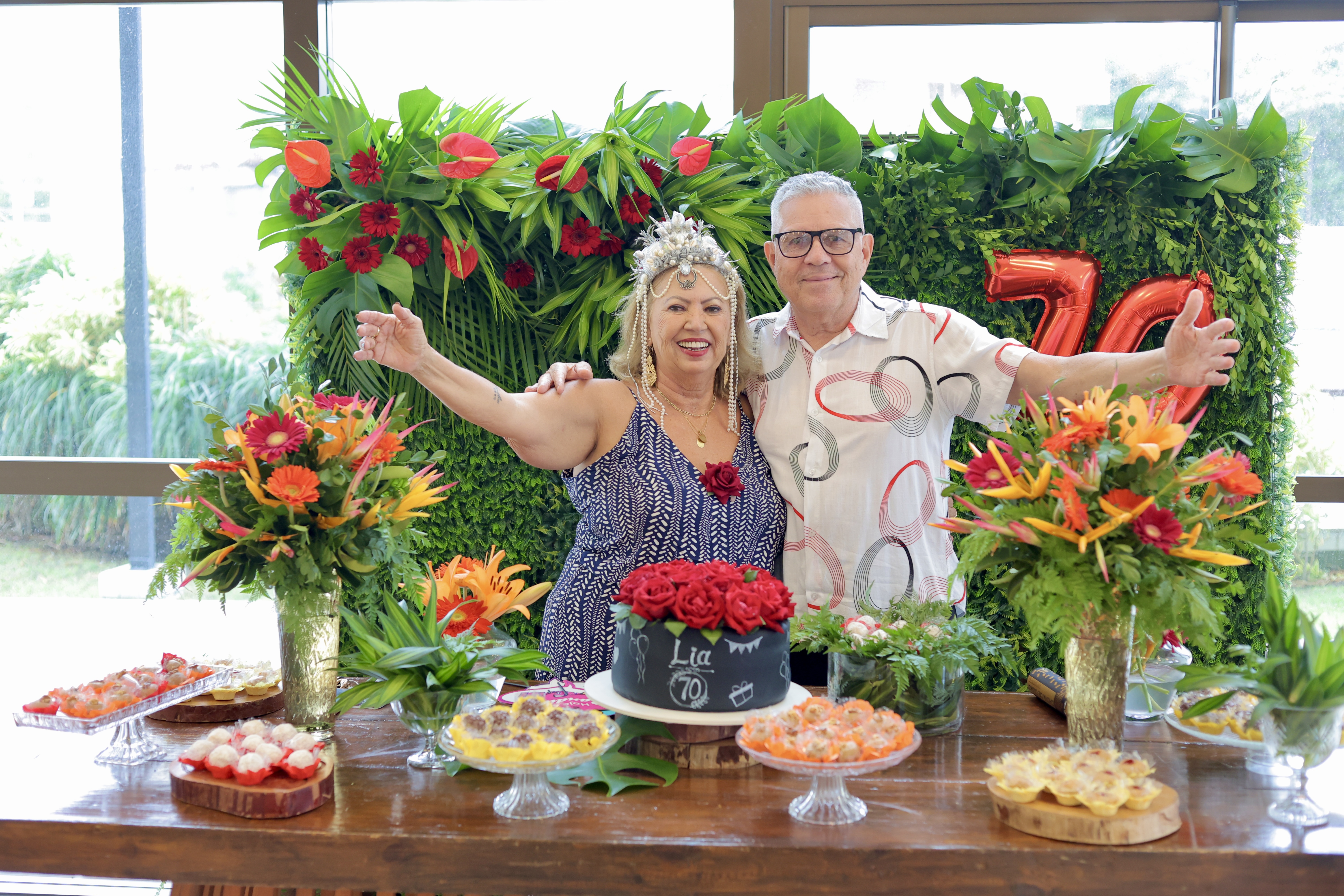 A aniversariante recebeu os convidados em um ambiente cuidadosamente decorado. O destaque ficou por conta do jardim vertical, que trazia o numeral 70 em evidência, simbolizando a nova década celebrada com entusiasmo, vitalidade e gratidão.