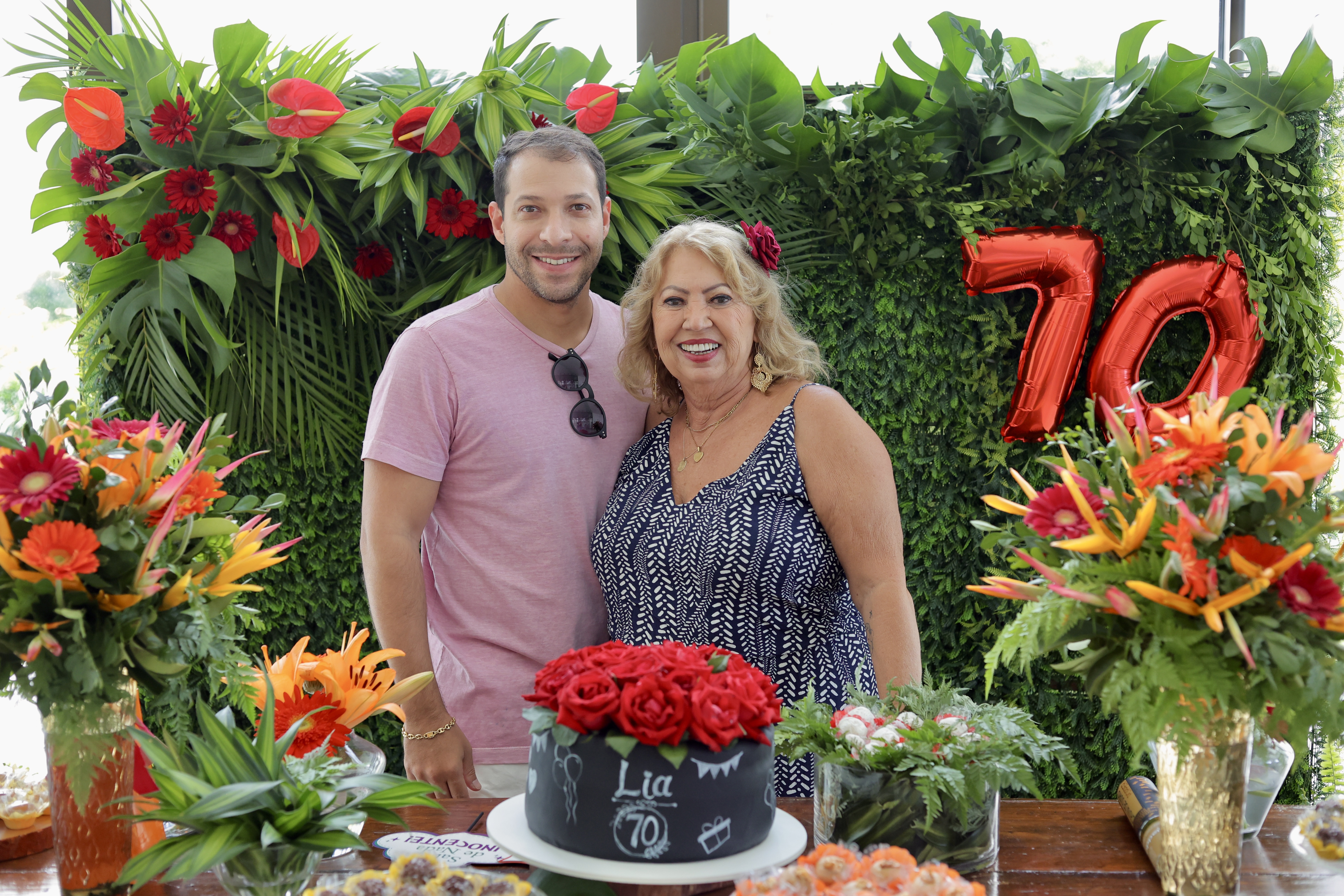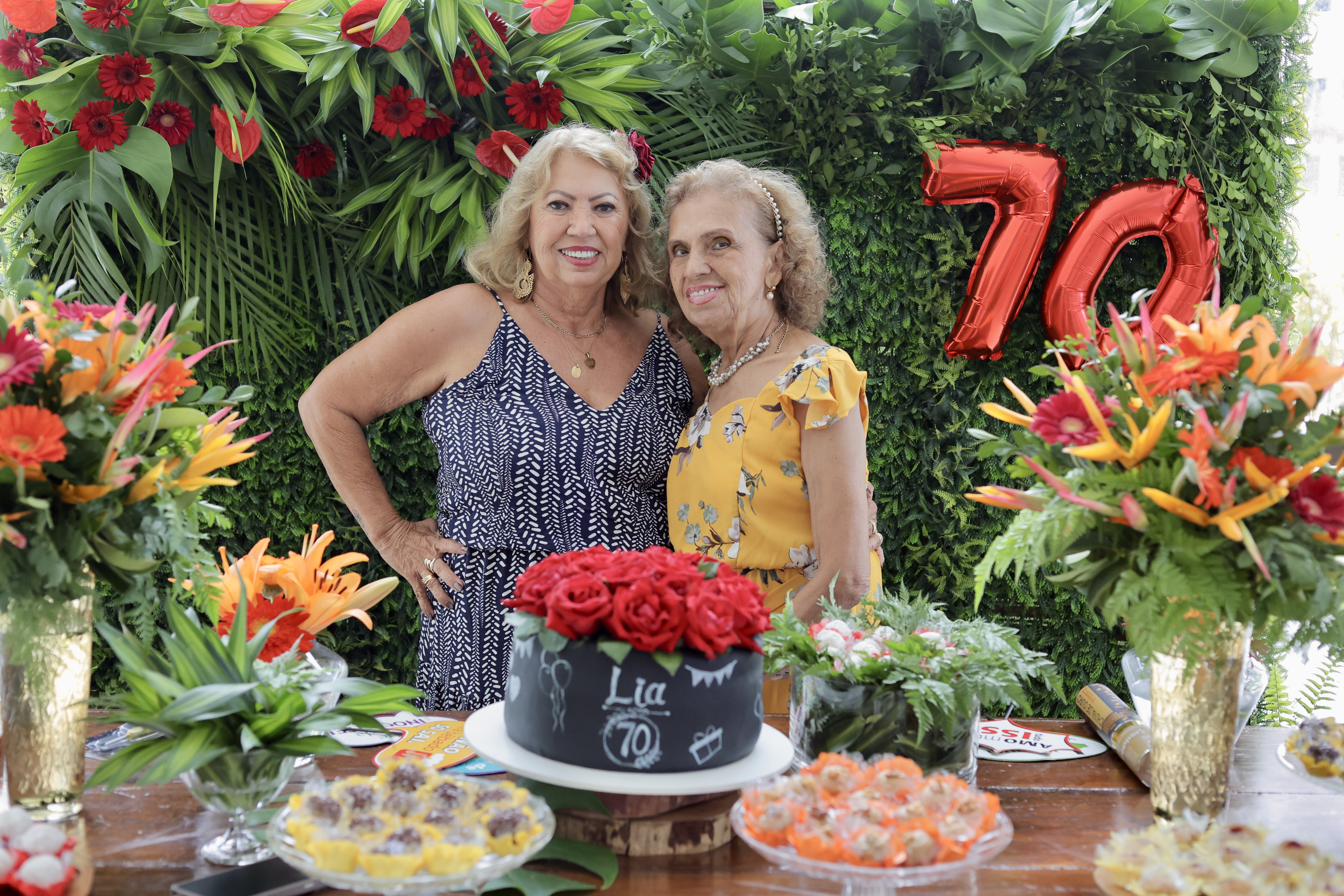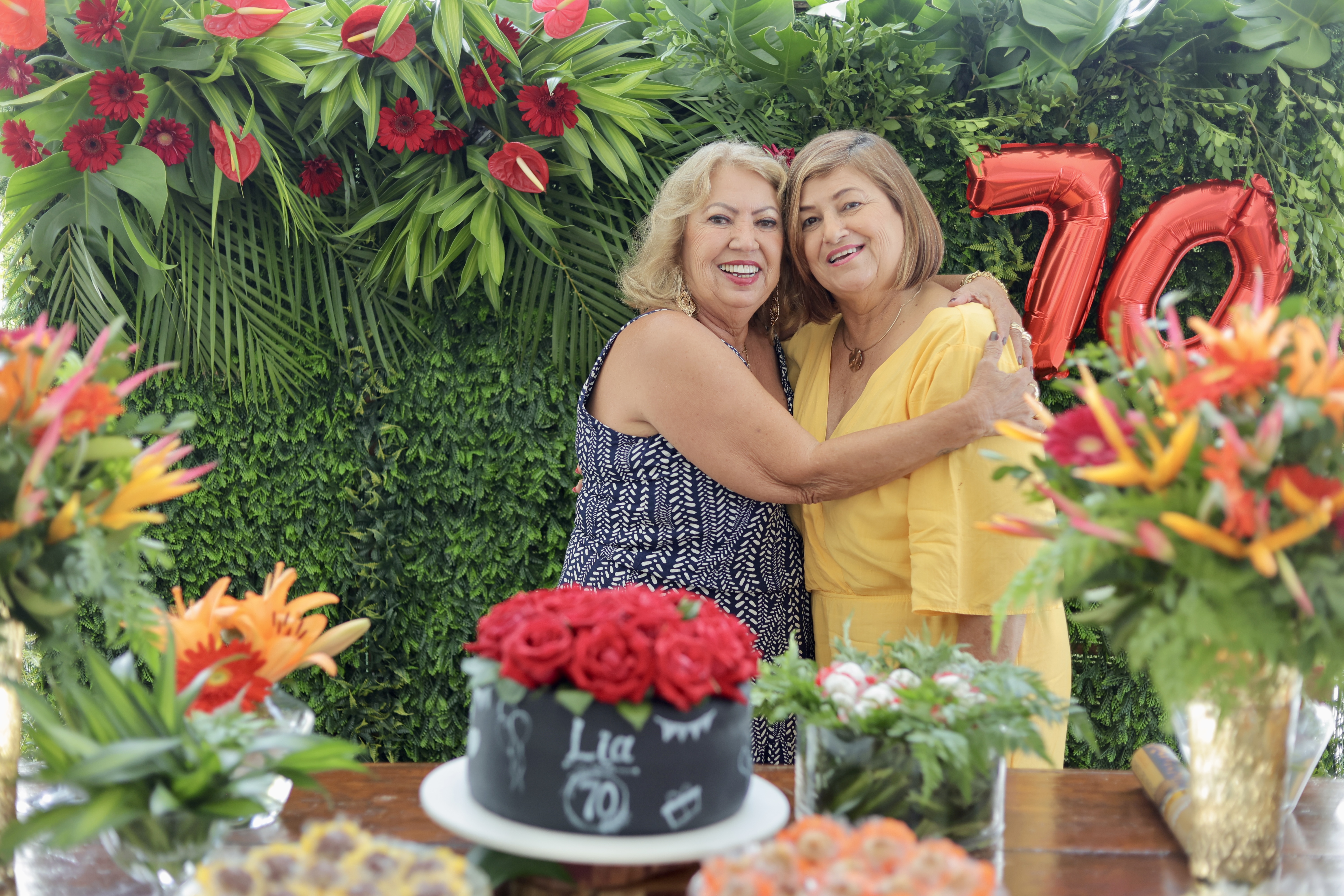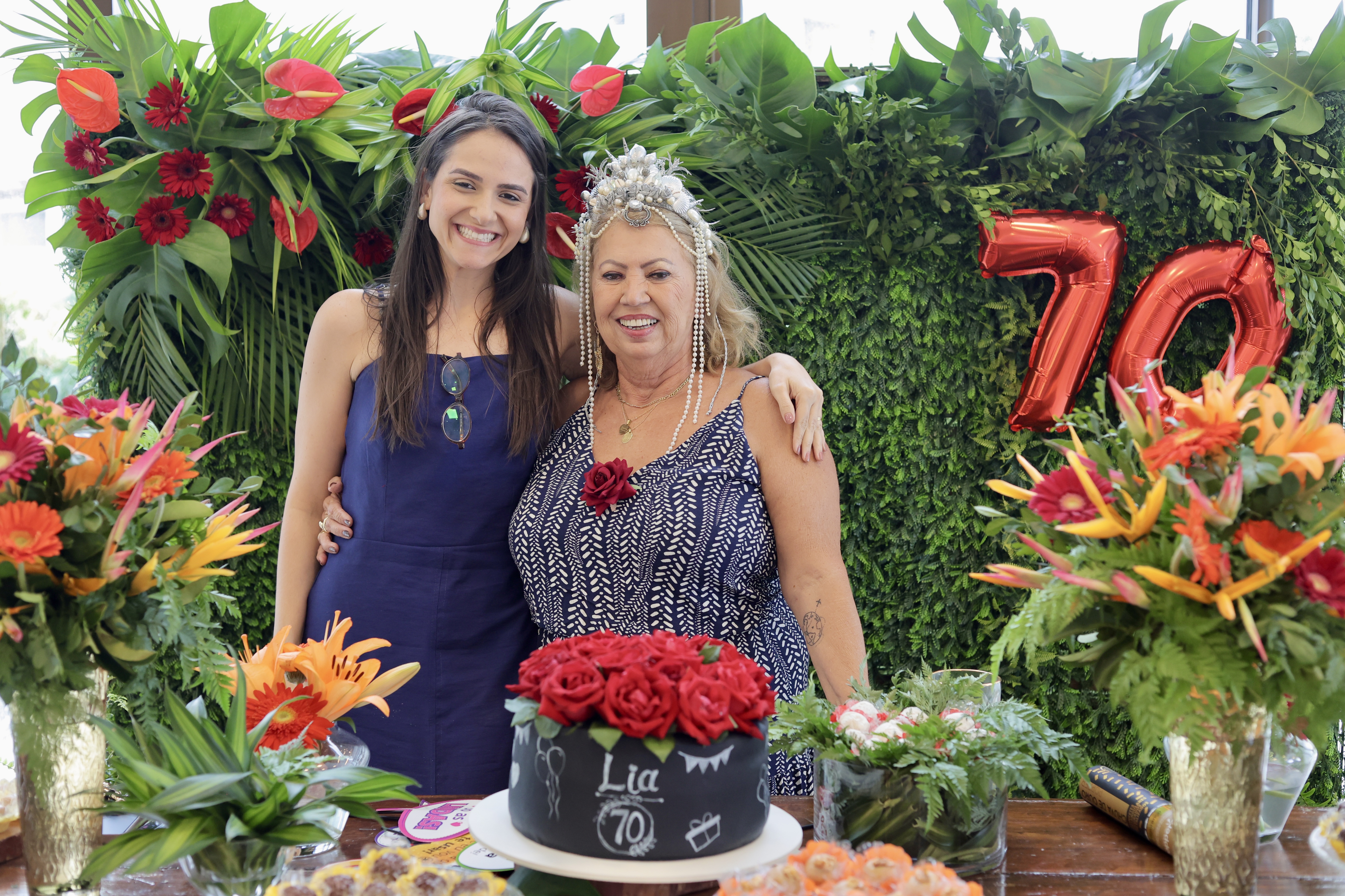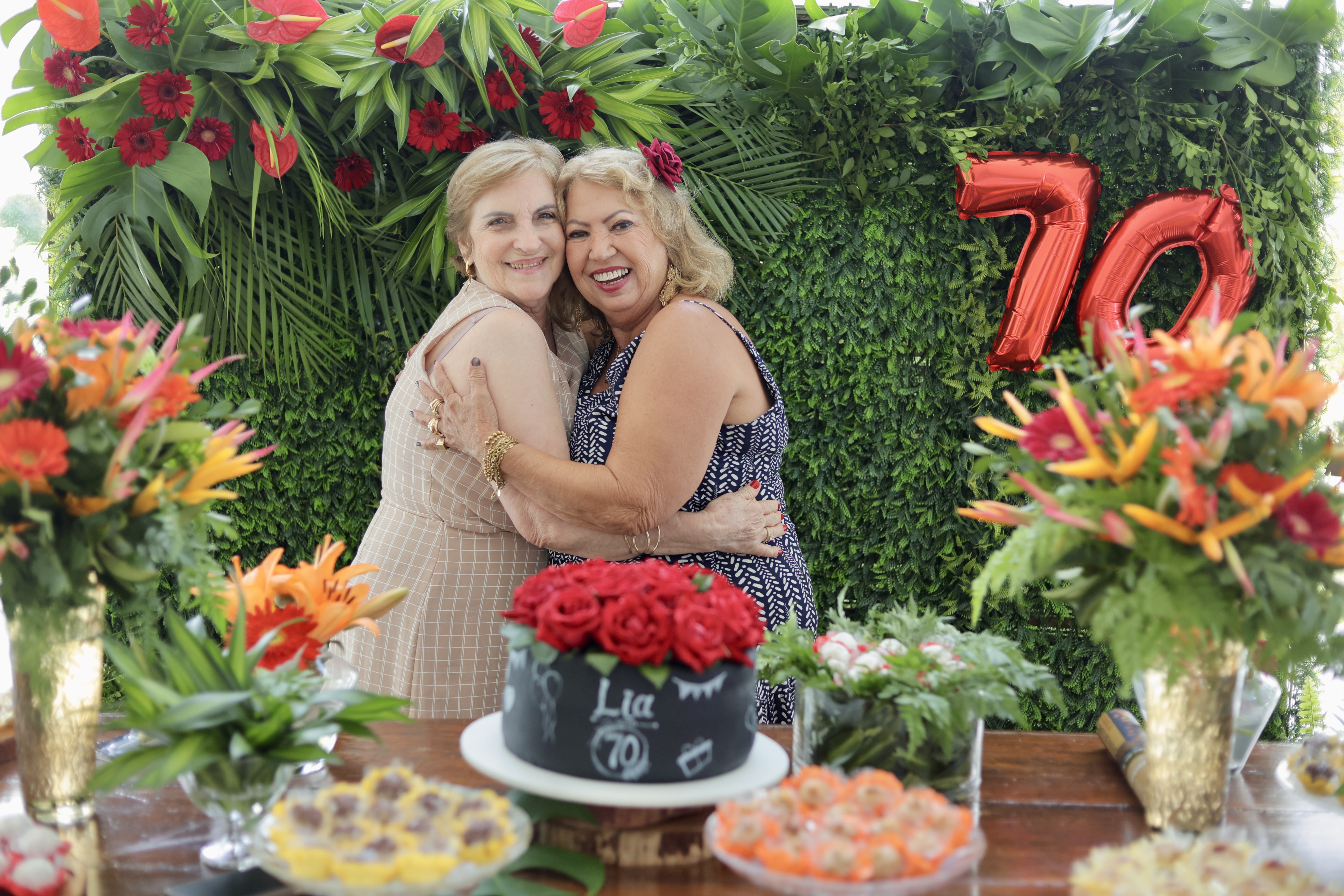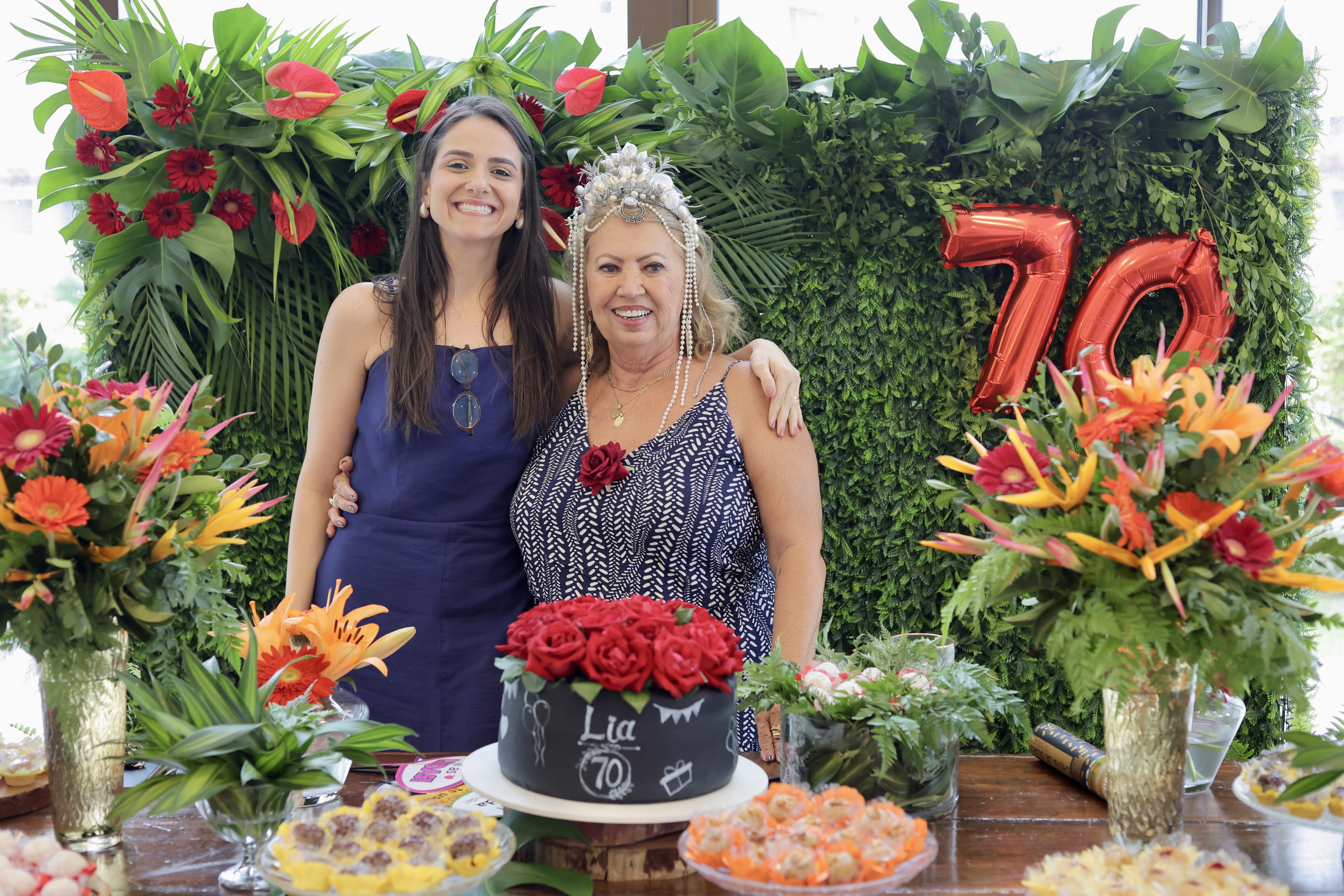 A aniversariante recebeu os convidados em um ambiente cuidadosamente decorado. O destaque ficou por conta do jardim vertical, que trazia o numeral 70 em evidência, simbolizando a nova década celebrada com entusiasmo, vitalidade e gratidão.