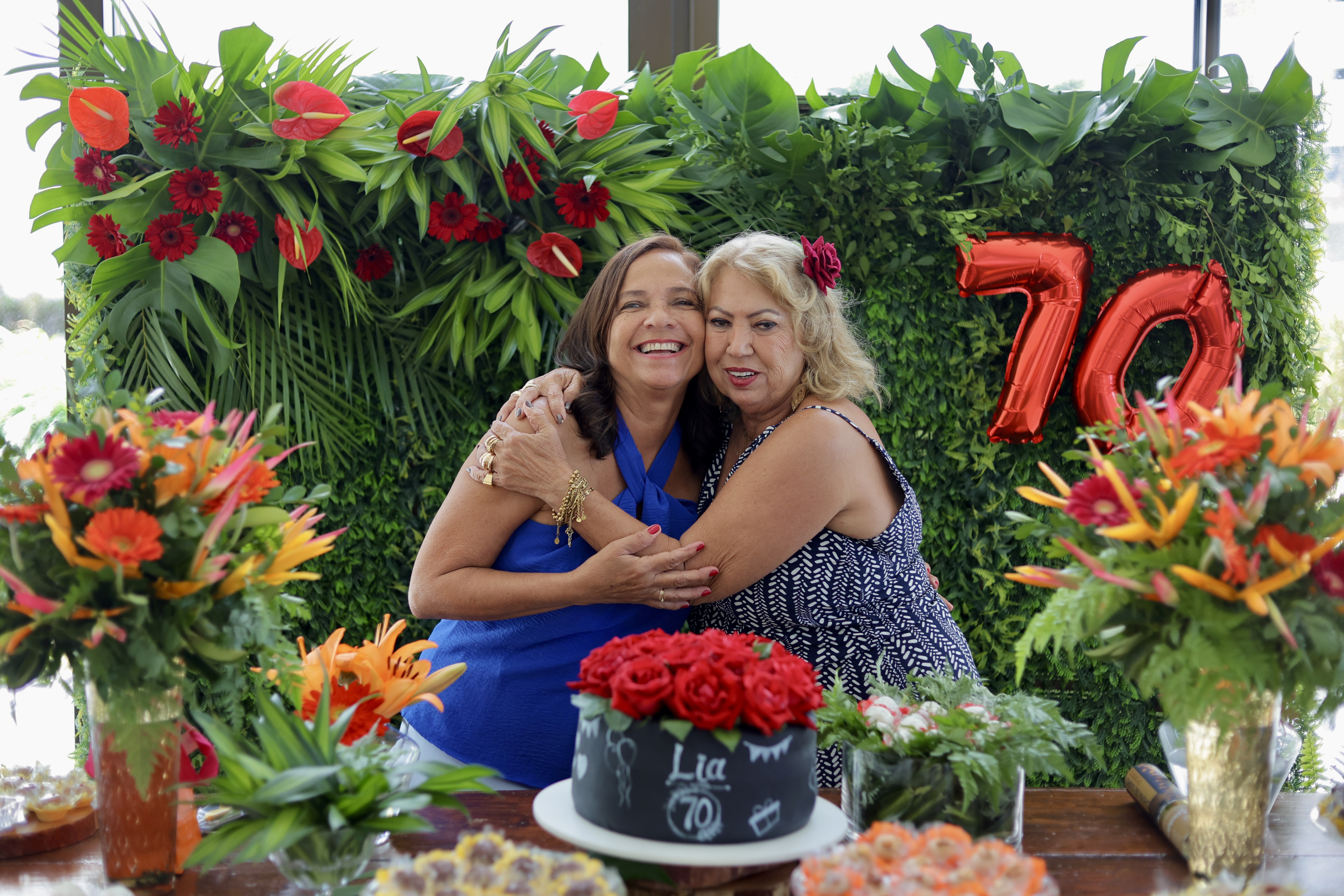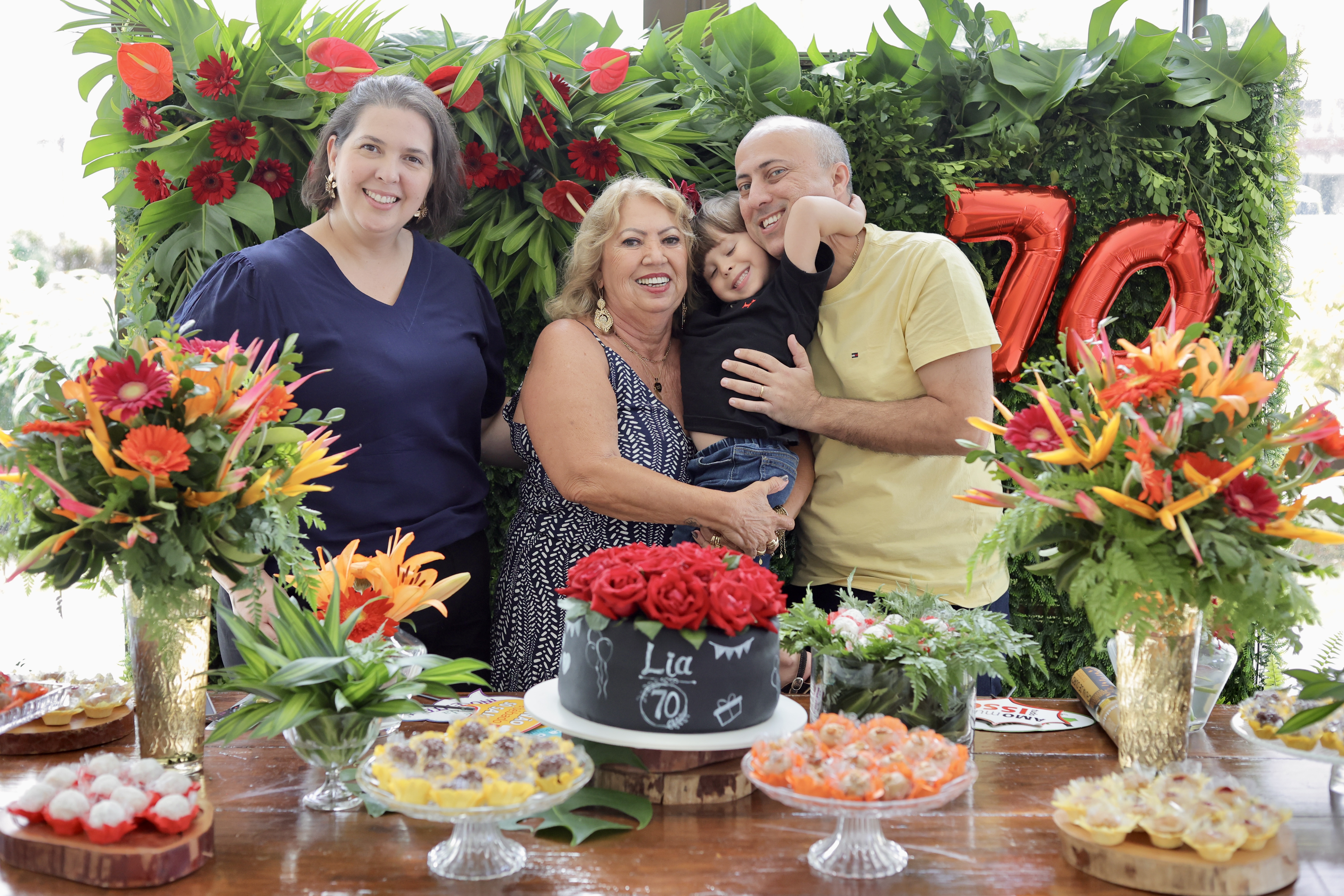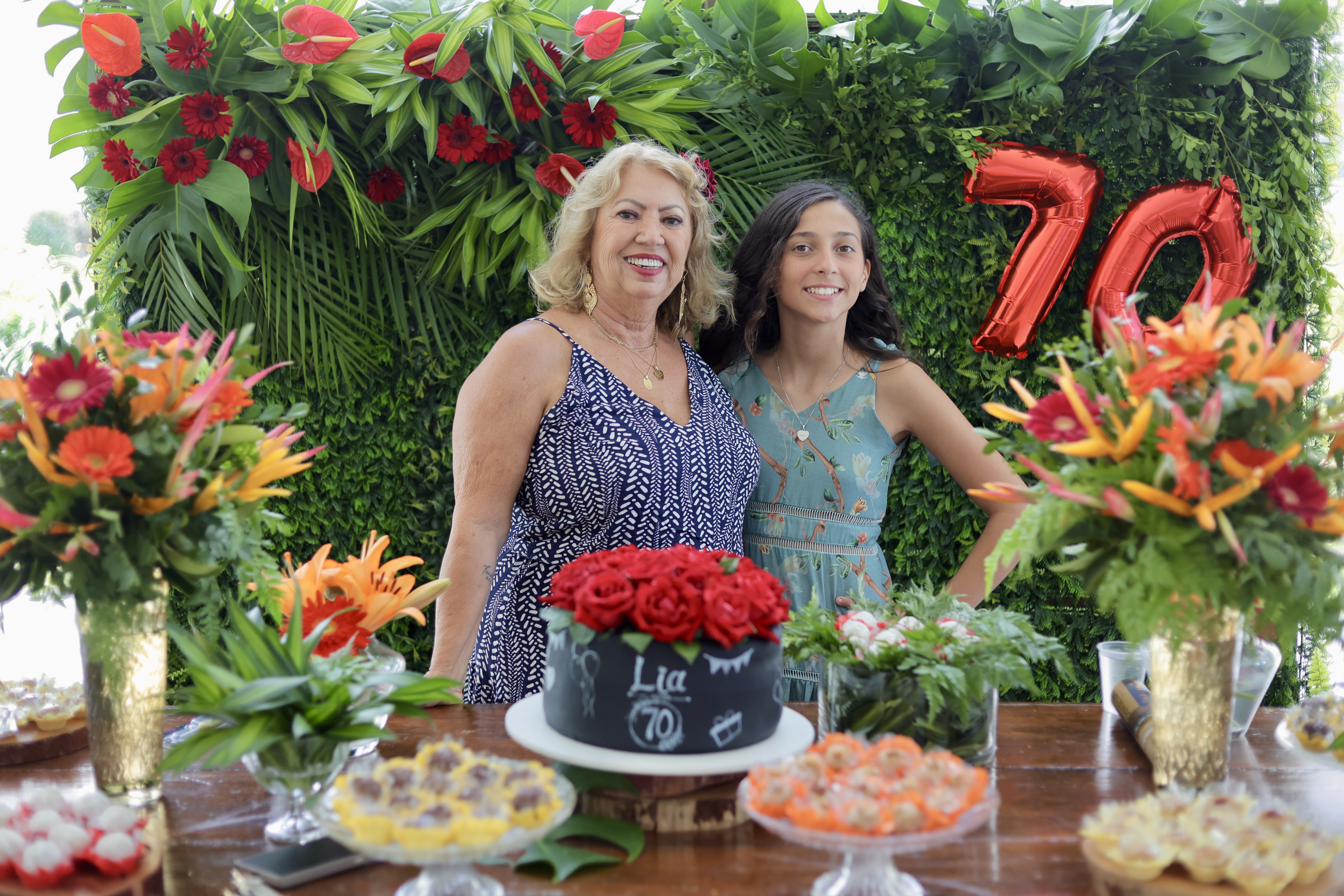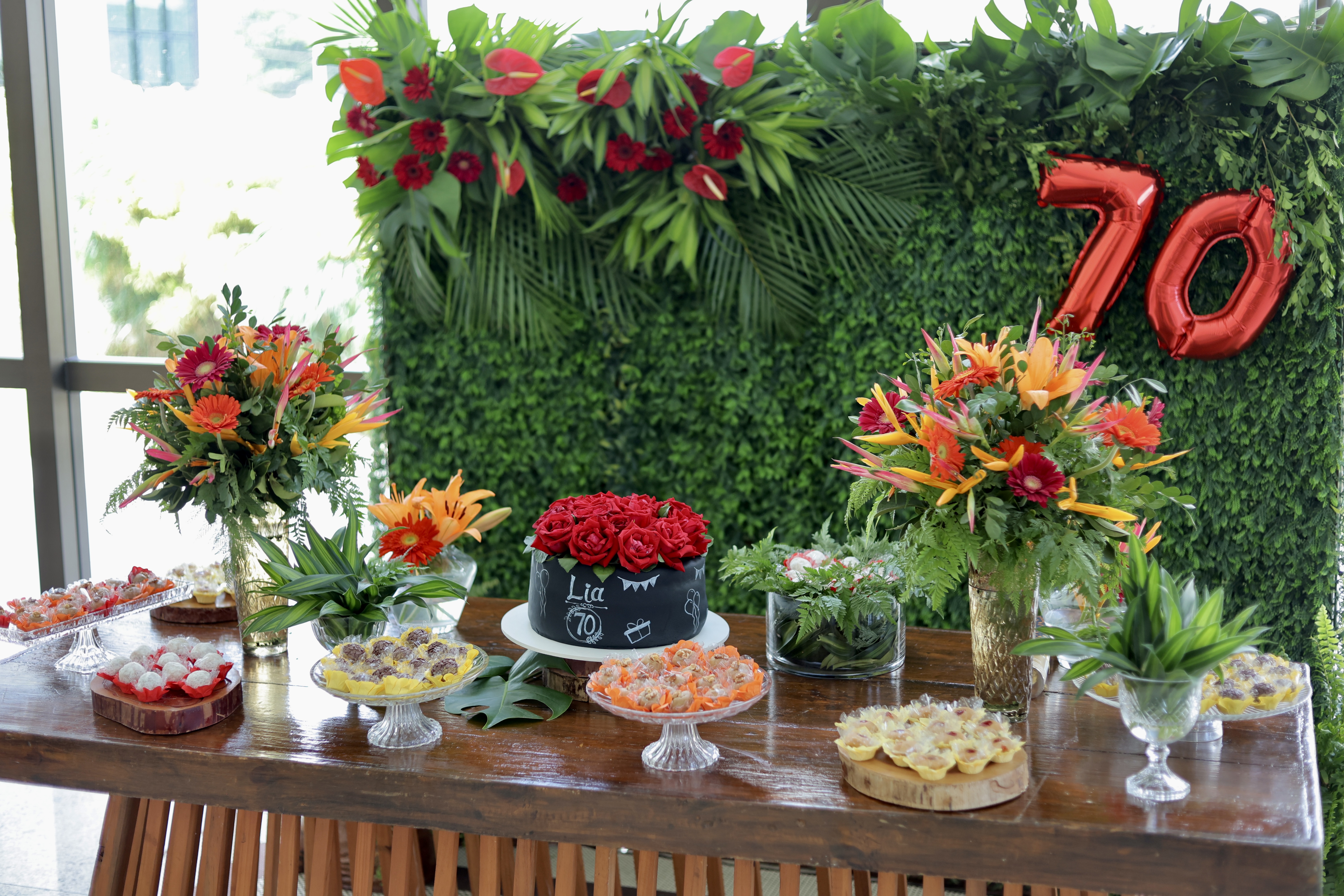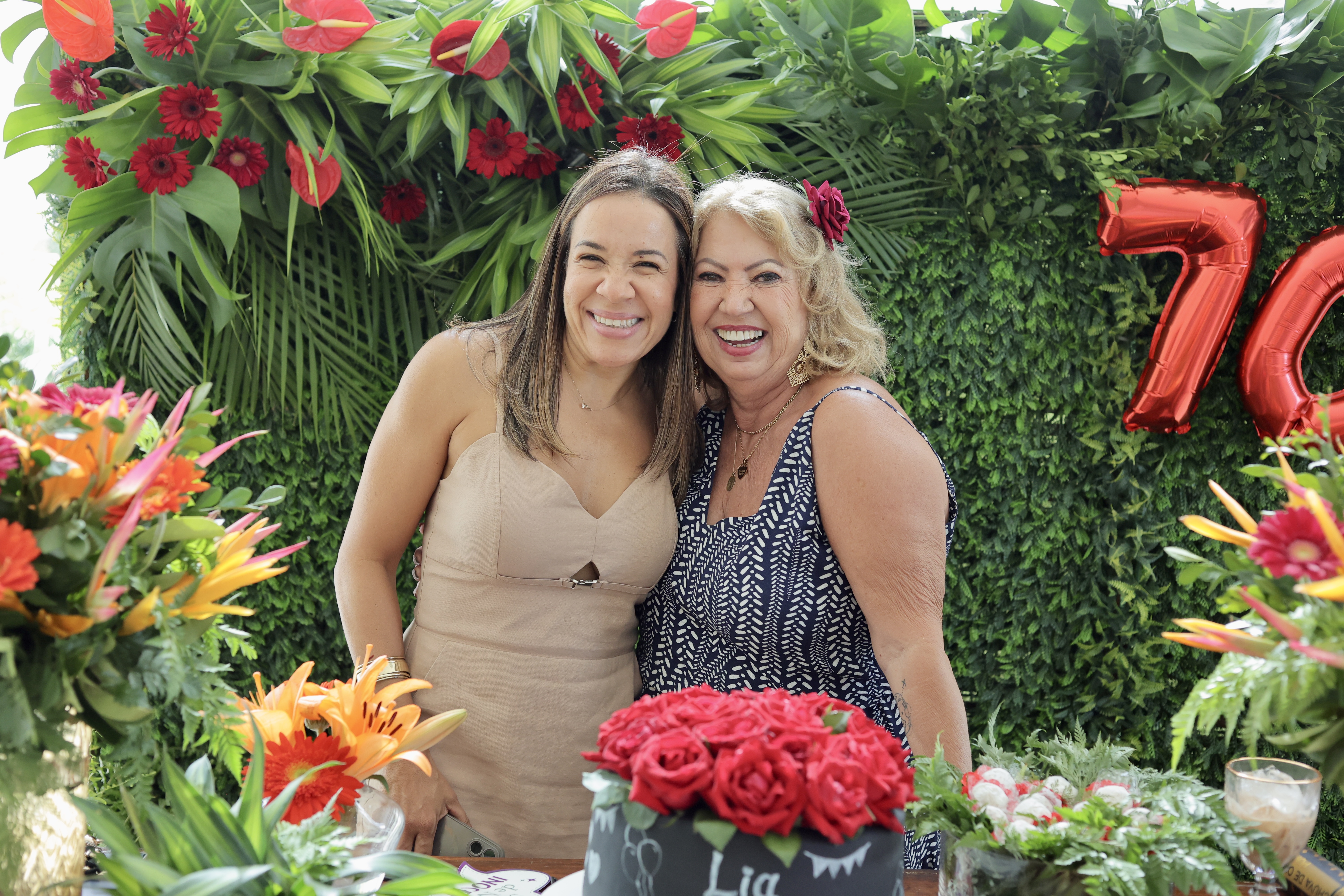 A aniversariante recebeu os convidados em um ambiente cuidadosamente decorado. O destaque ficou por conta do jardim vertical, que trazia o numeral 70 em evidência, simbolizando a nova década celebrada com entusiasmo, vitalidade e gratidão.
