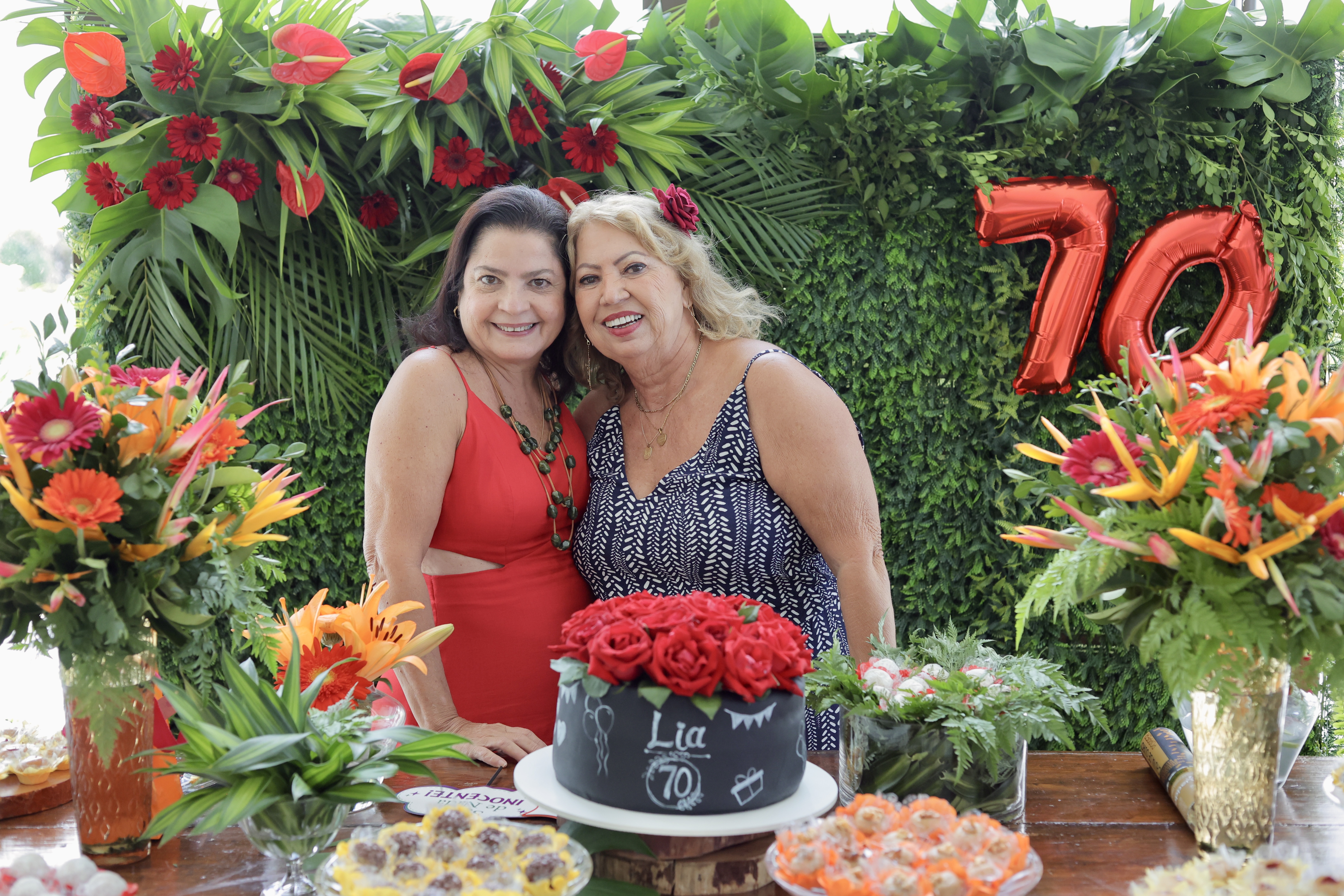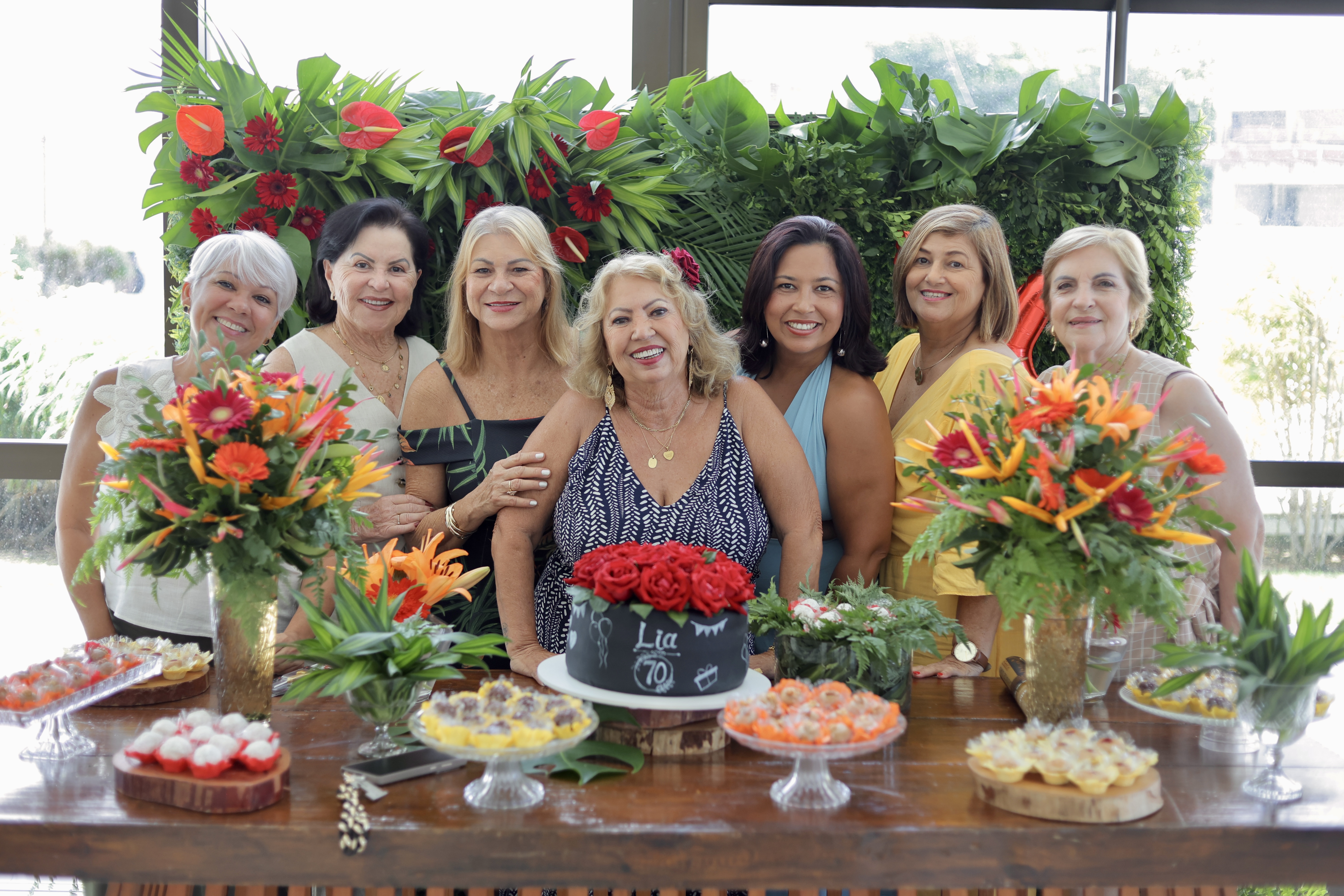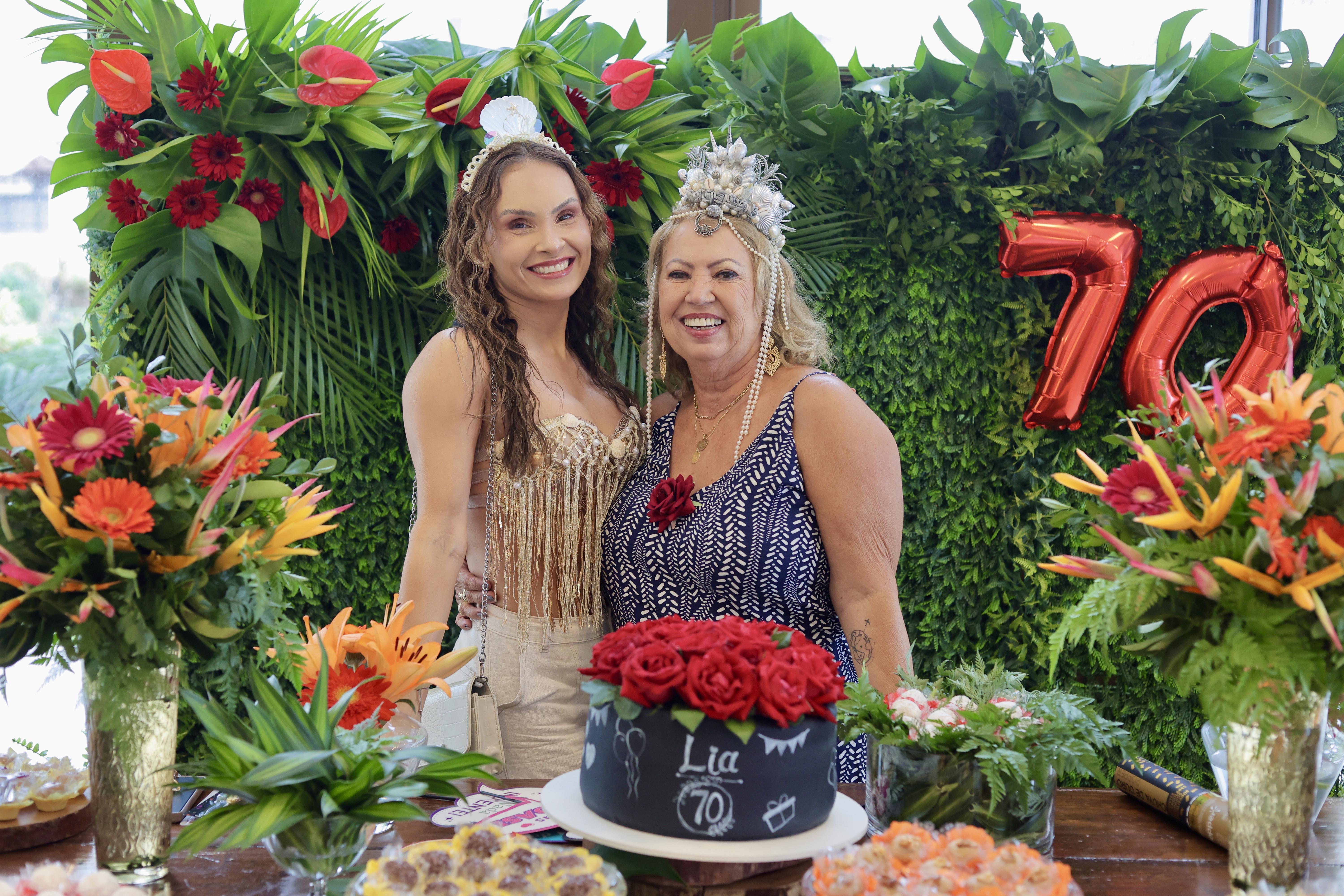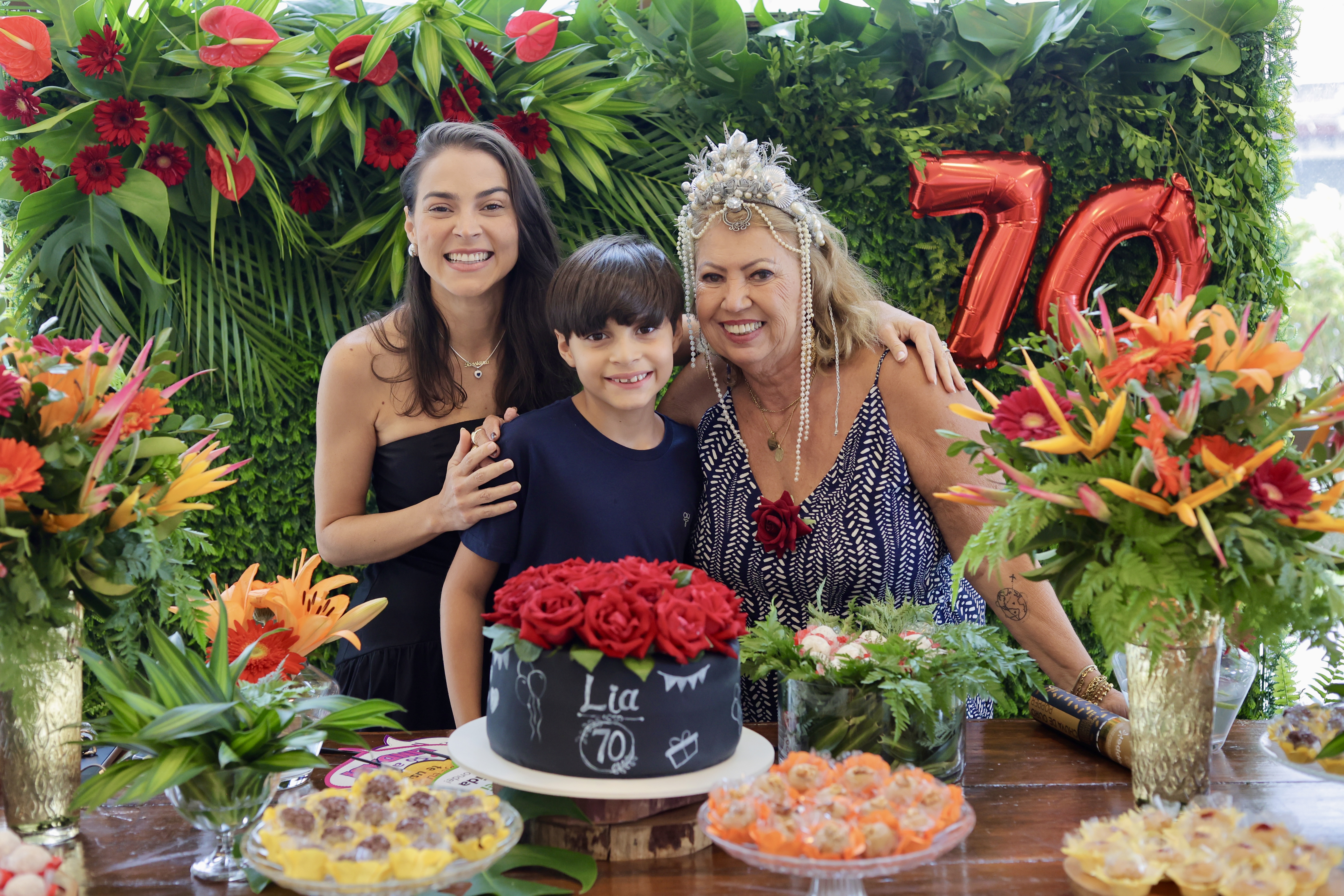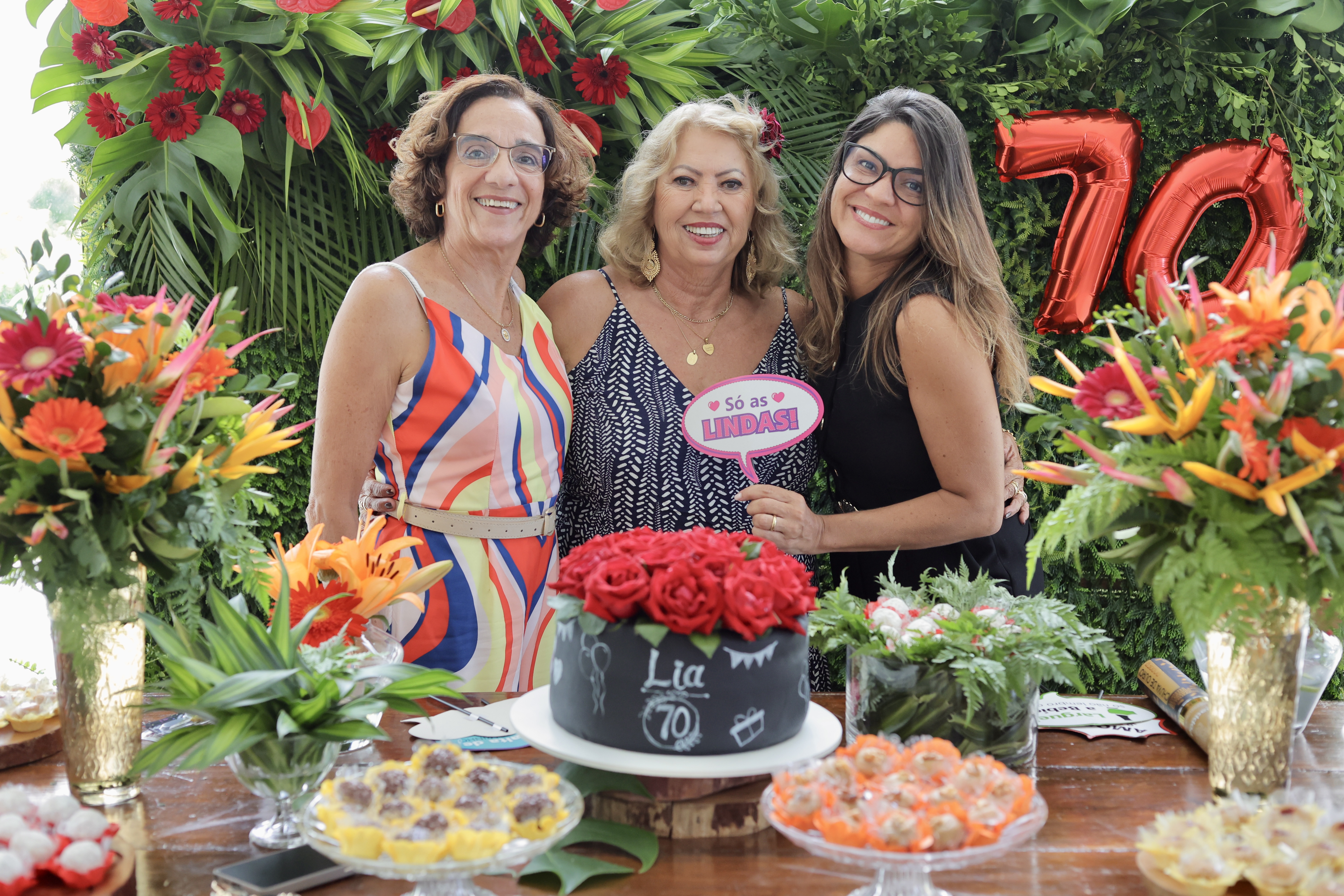 A aniversariante recebeu os convidados em um ambiente cuidadosamente decorado. O destaque ficou por conta do jardim vertical, que trazia o numeral 70 em evidência, simbolizando a nova década celebrada com entusiasmo, vitalidade e gratidão.