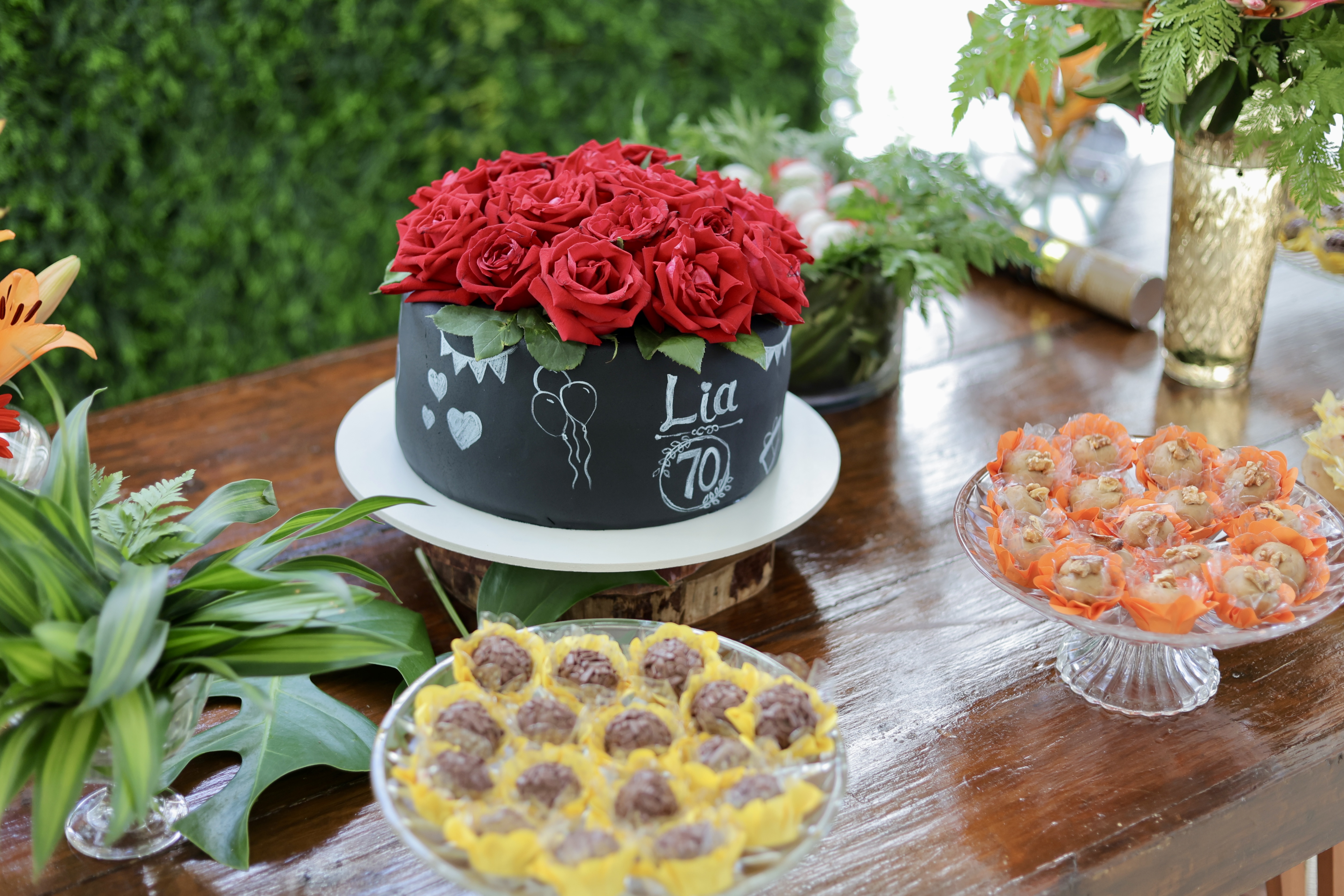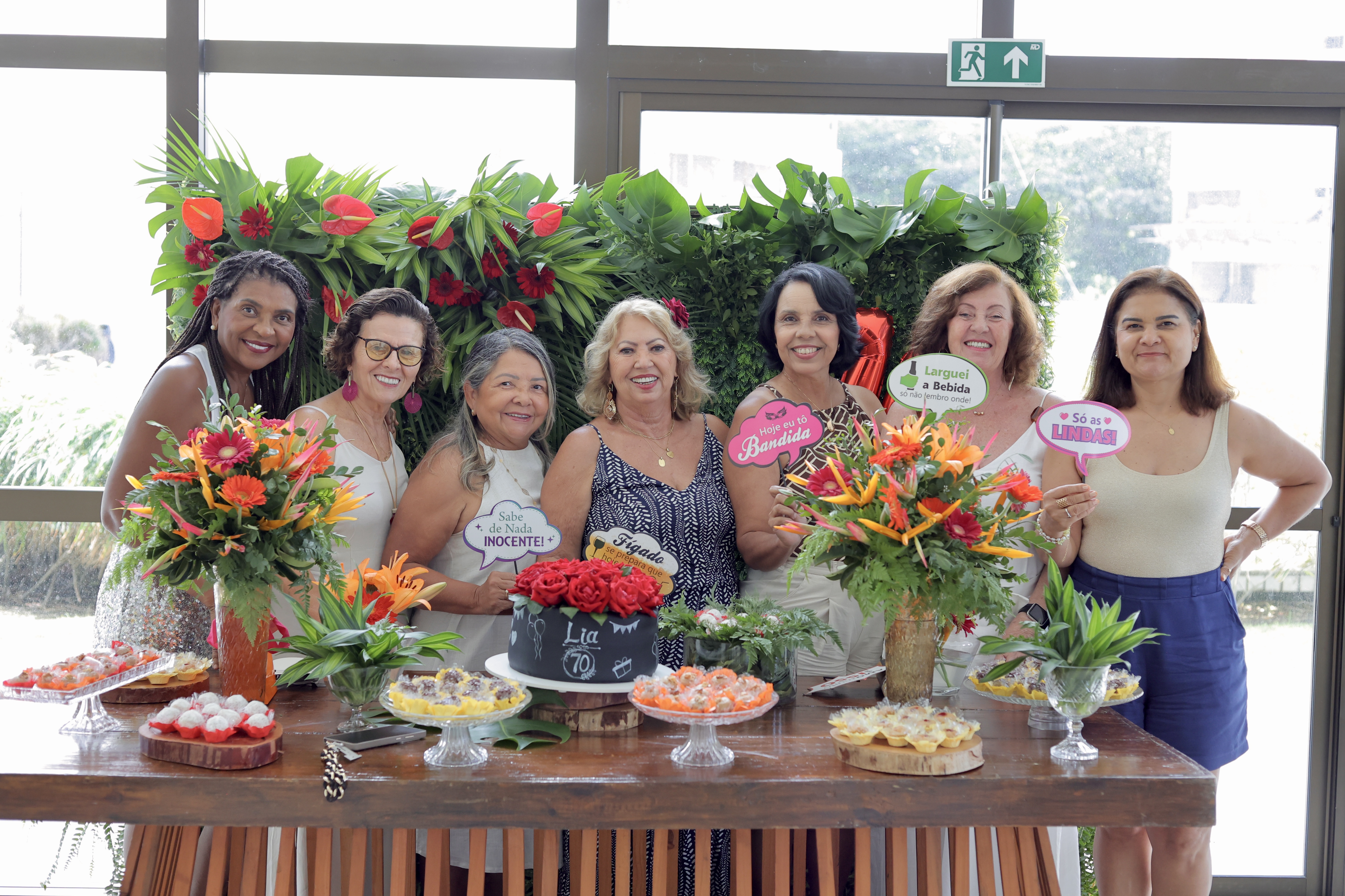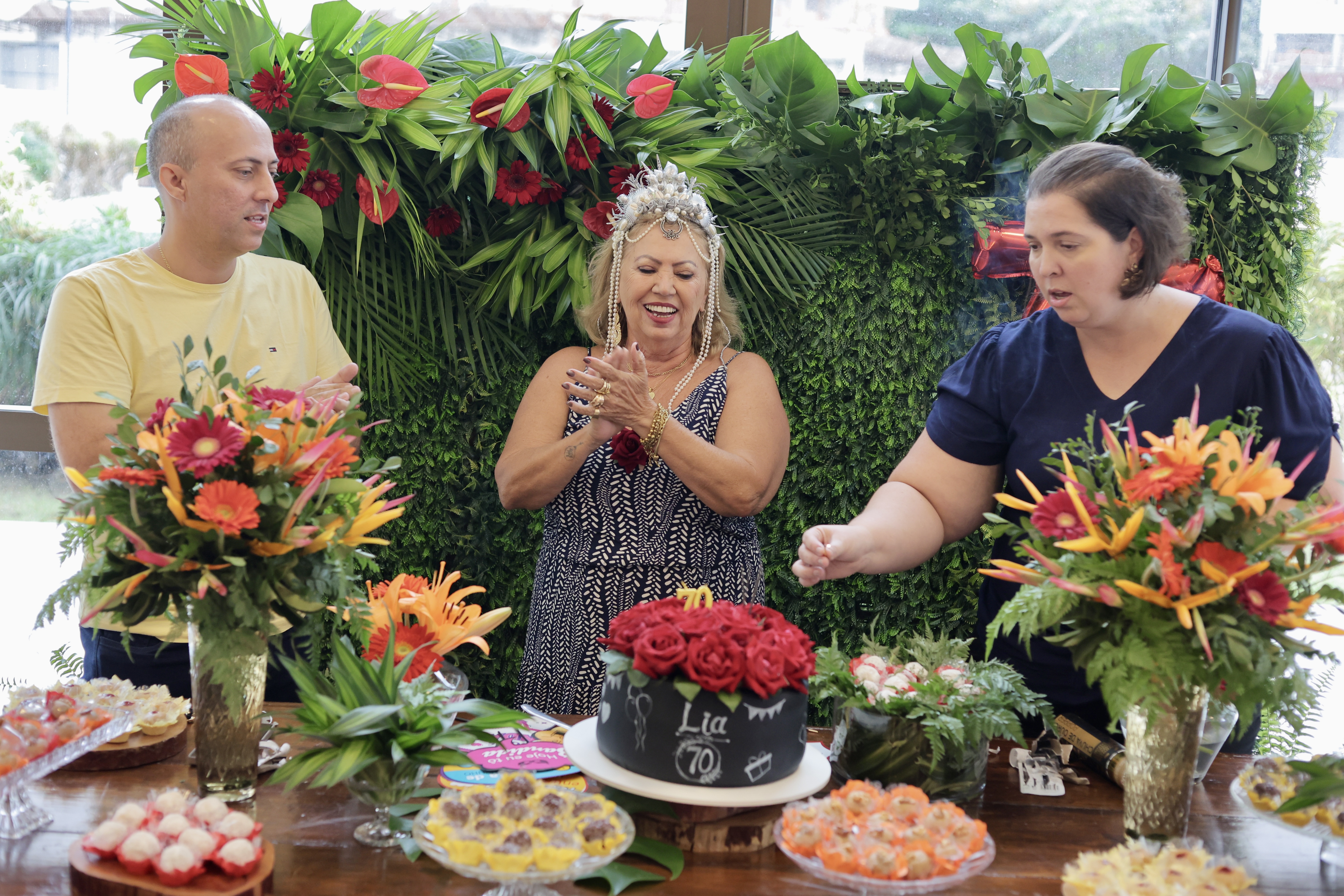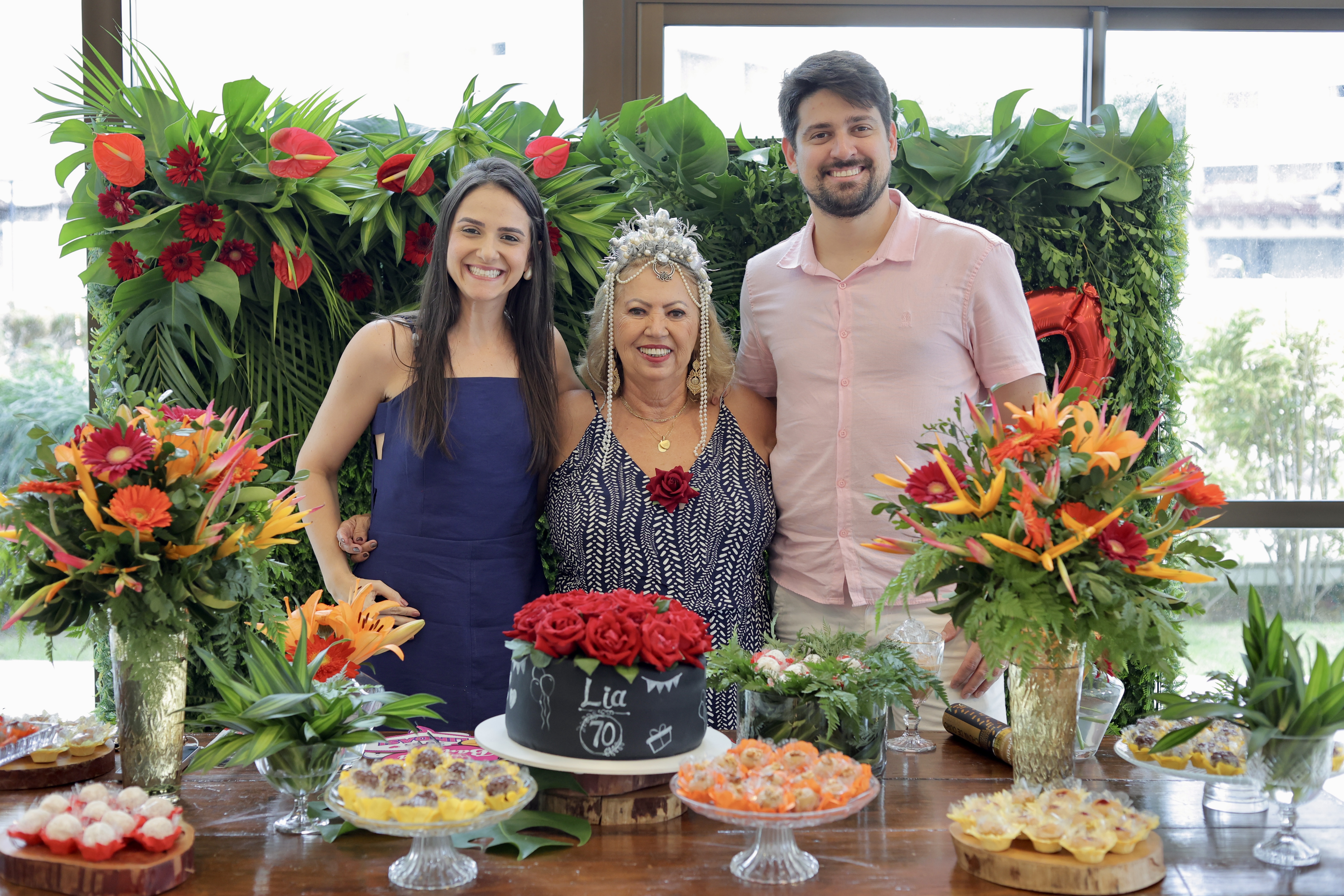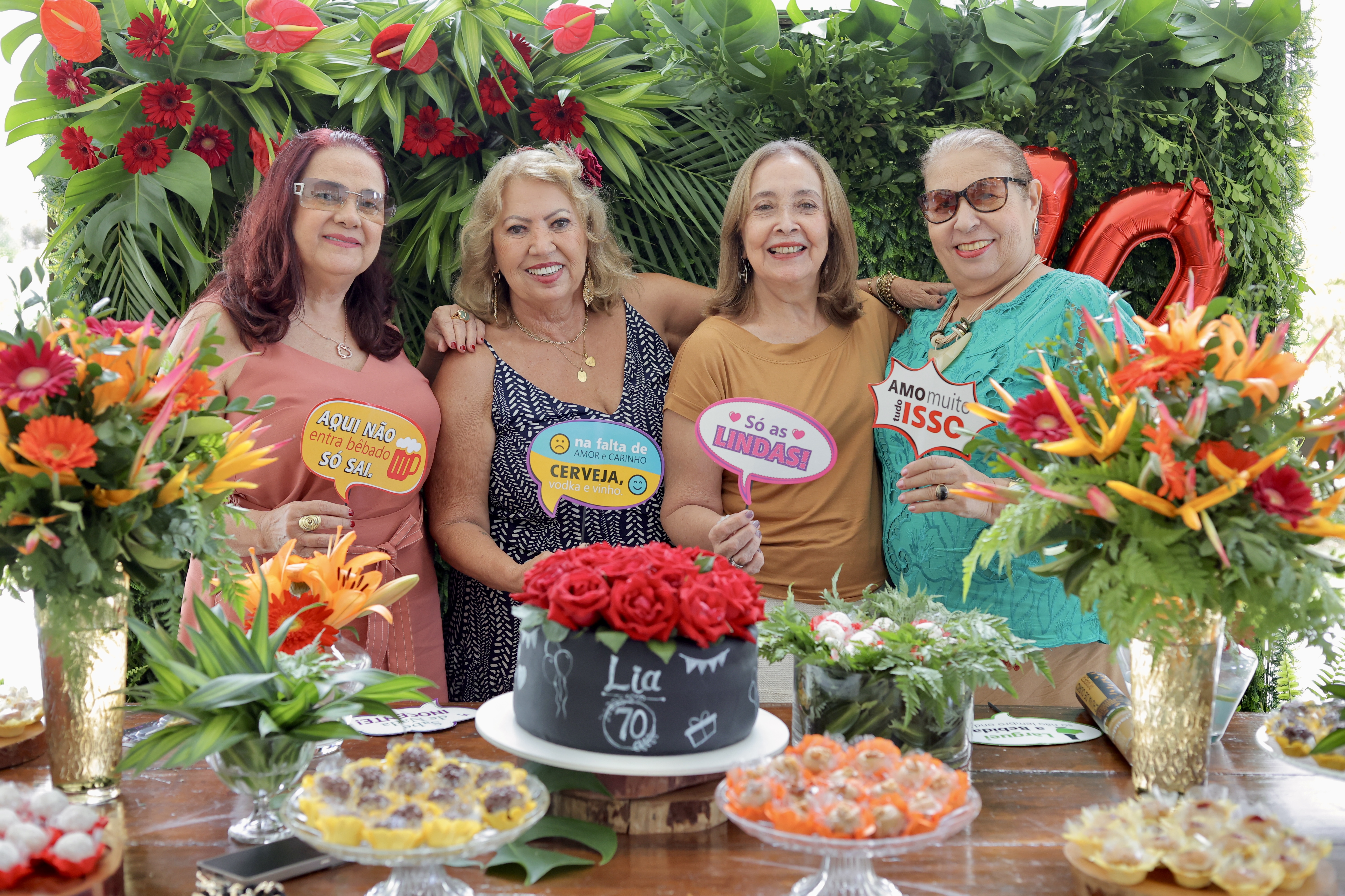 A aniversariante recebeu os convidados em um ambiente cuidadosamente decorado. O destaque ficou por conta do jardim vertical, que trazia o numeral 70 em evidência, simbolizando a nova década celebrada com entusiasmo, vitalidade e gratidão.